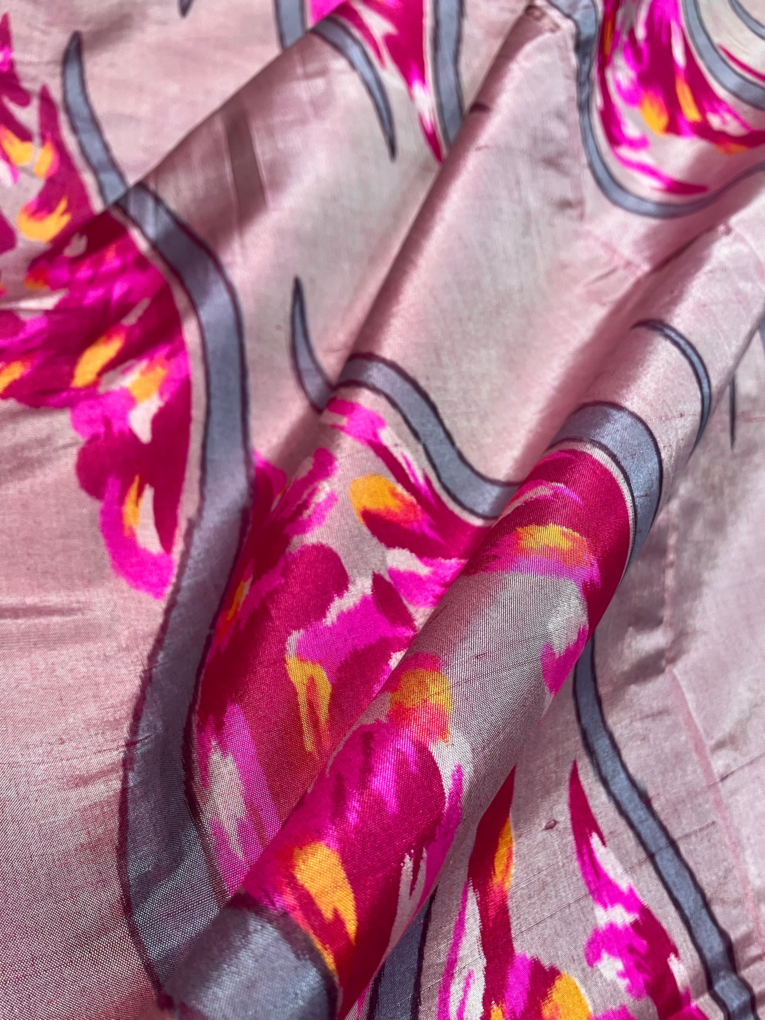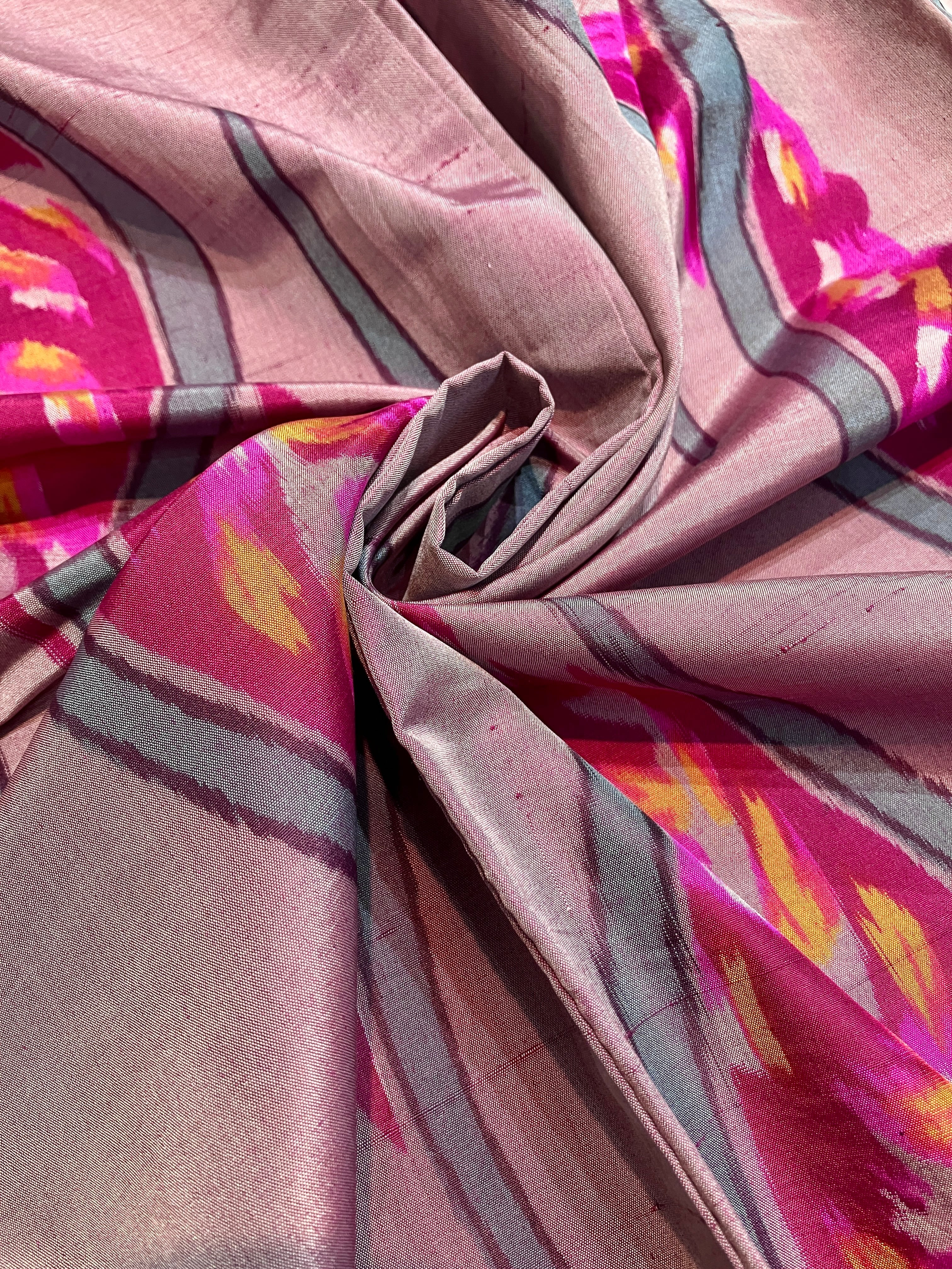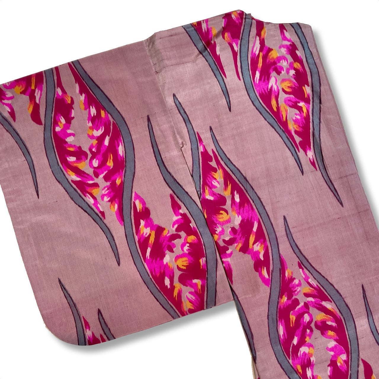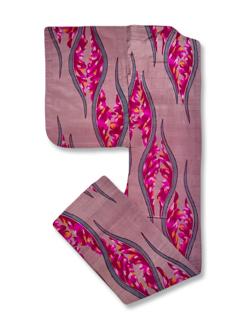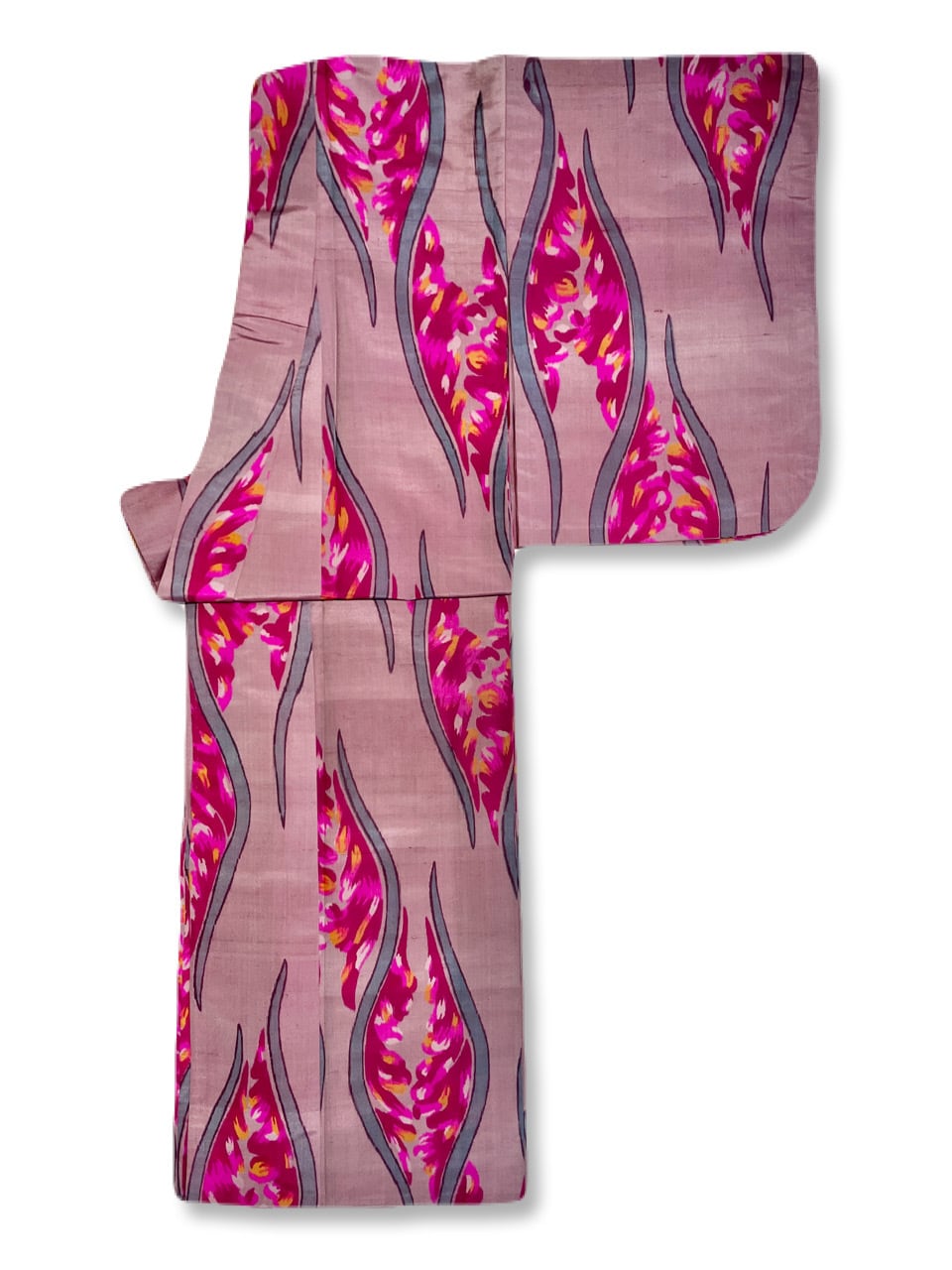 ピンクグレーの地にブルーグレーの立涌と、その中にはマゼンタ色の花びらのような羽