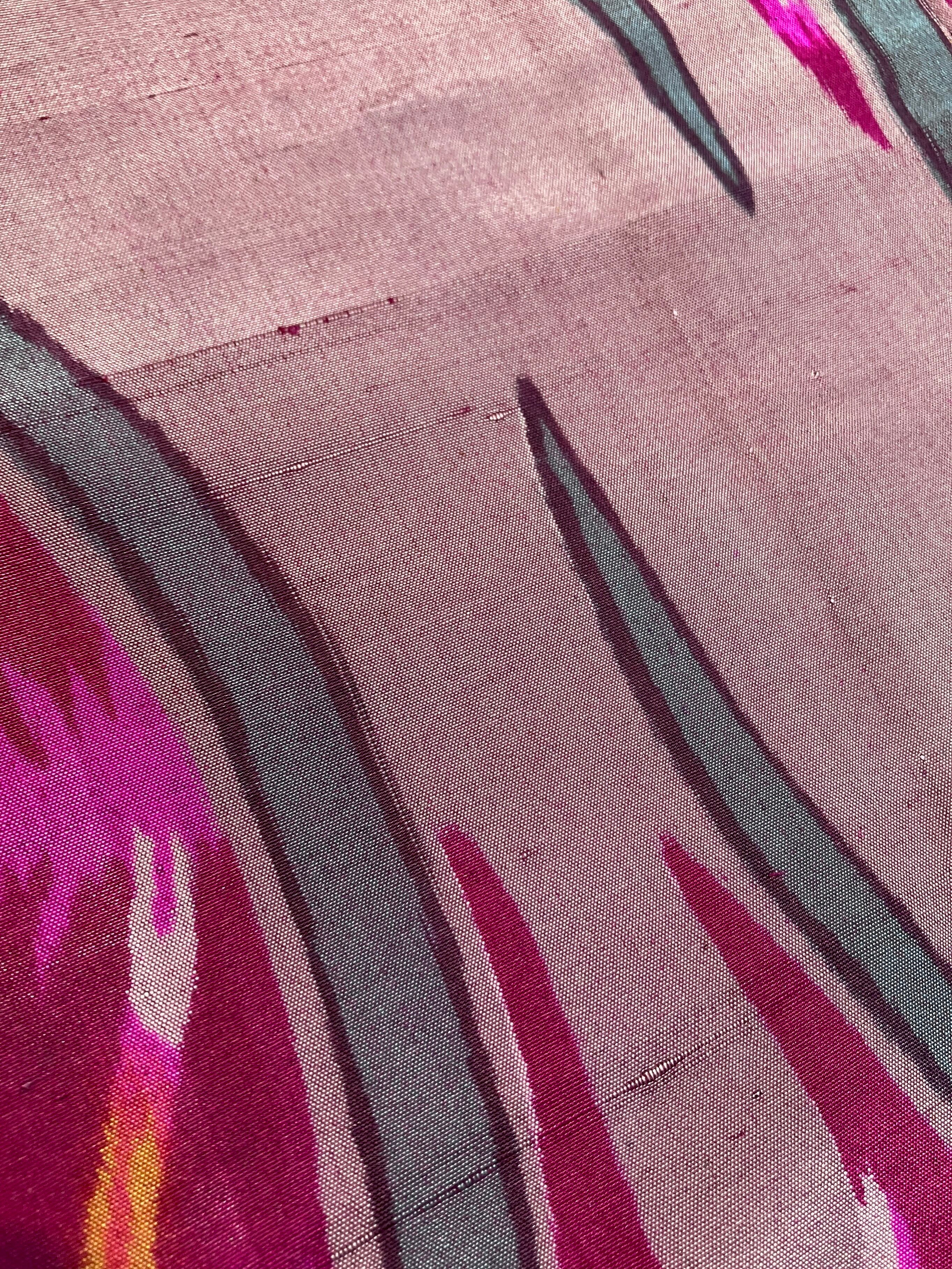 落ち着いた色味でツヤがあり、薄手でツルッとした質感が特徴の解し織銘仙です。
