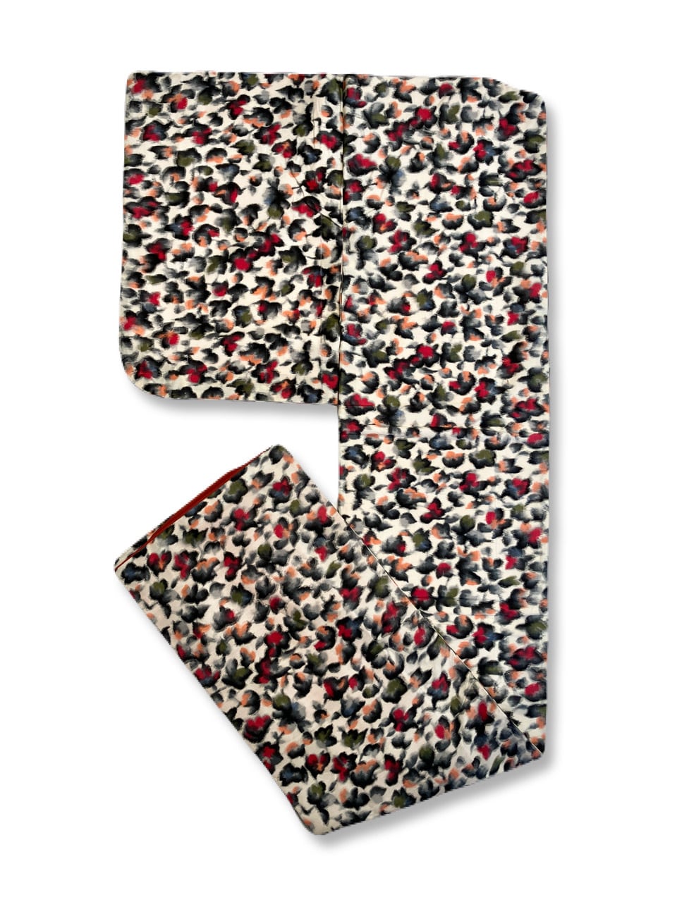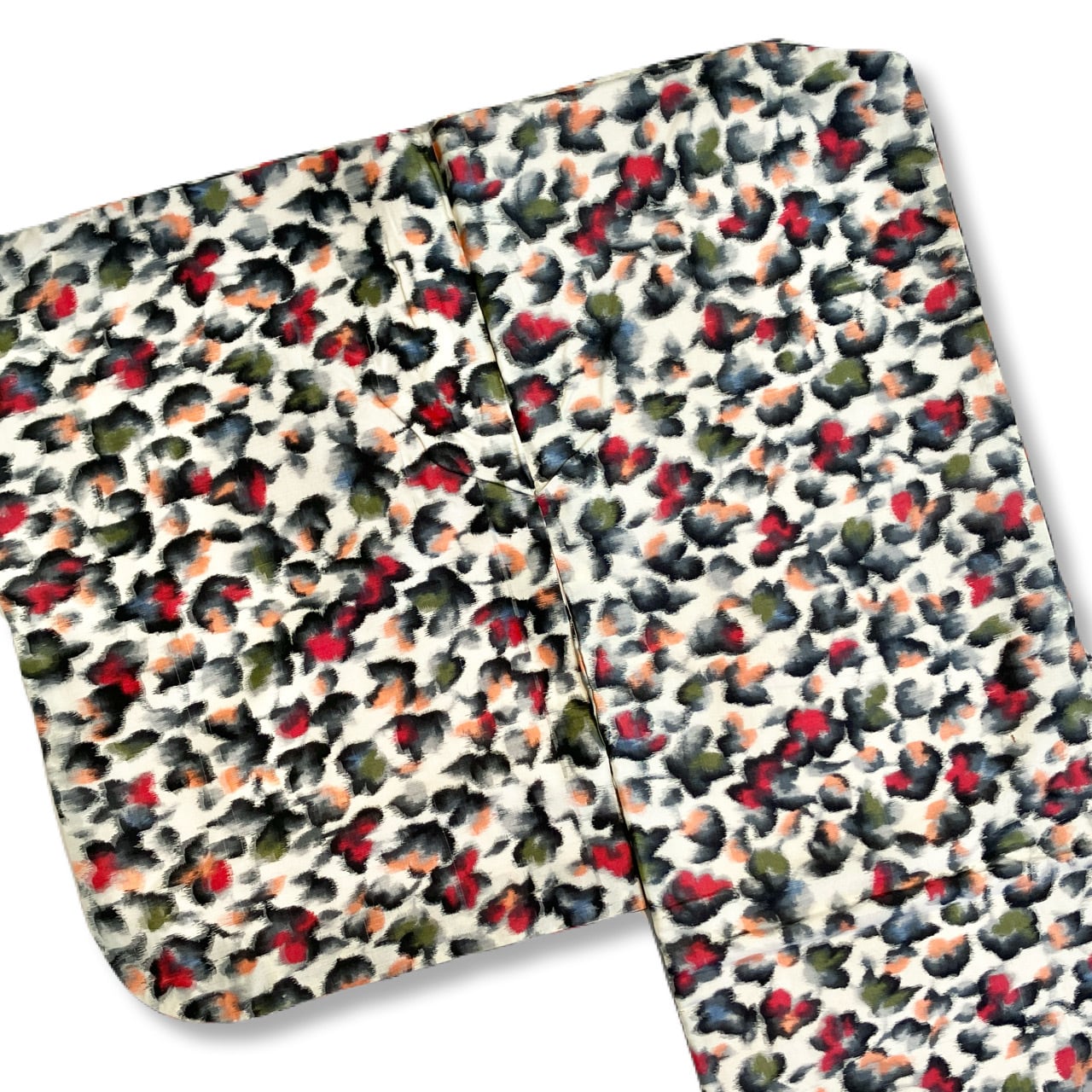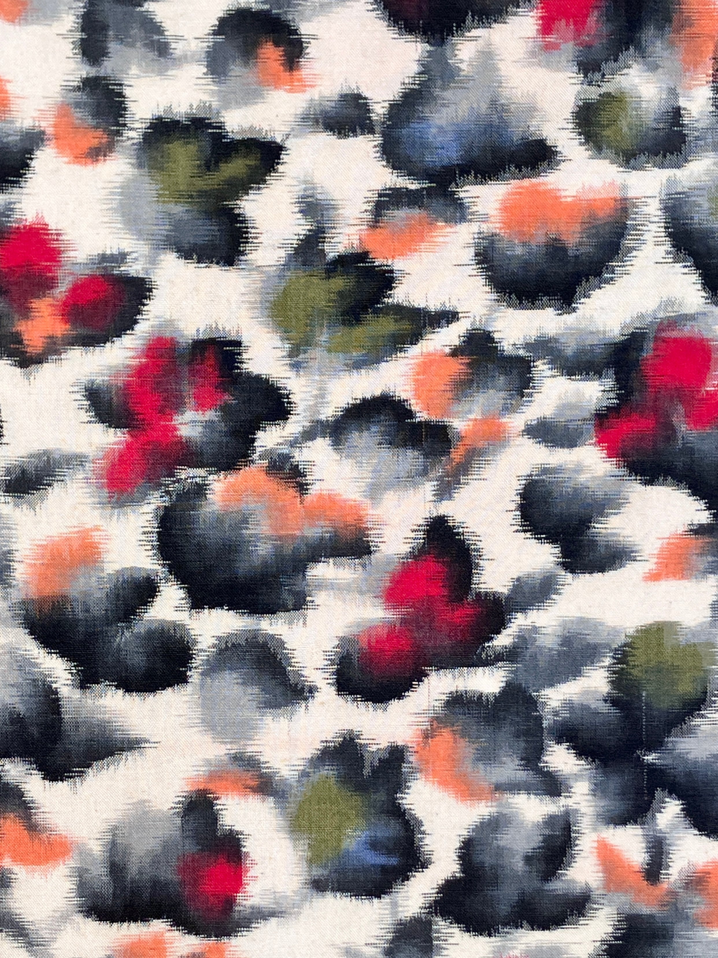 オフホワイトの地に黒〜グレーと赤、オレンジ、緑のカラフルな小さな葉っぱ柄