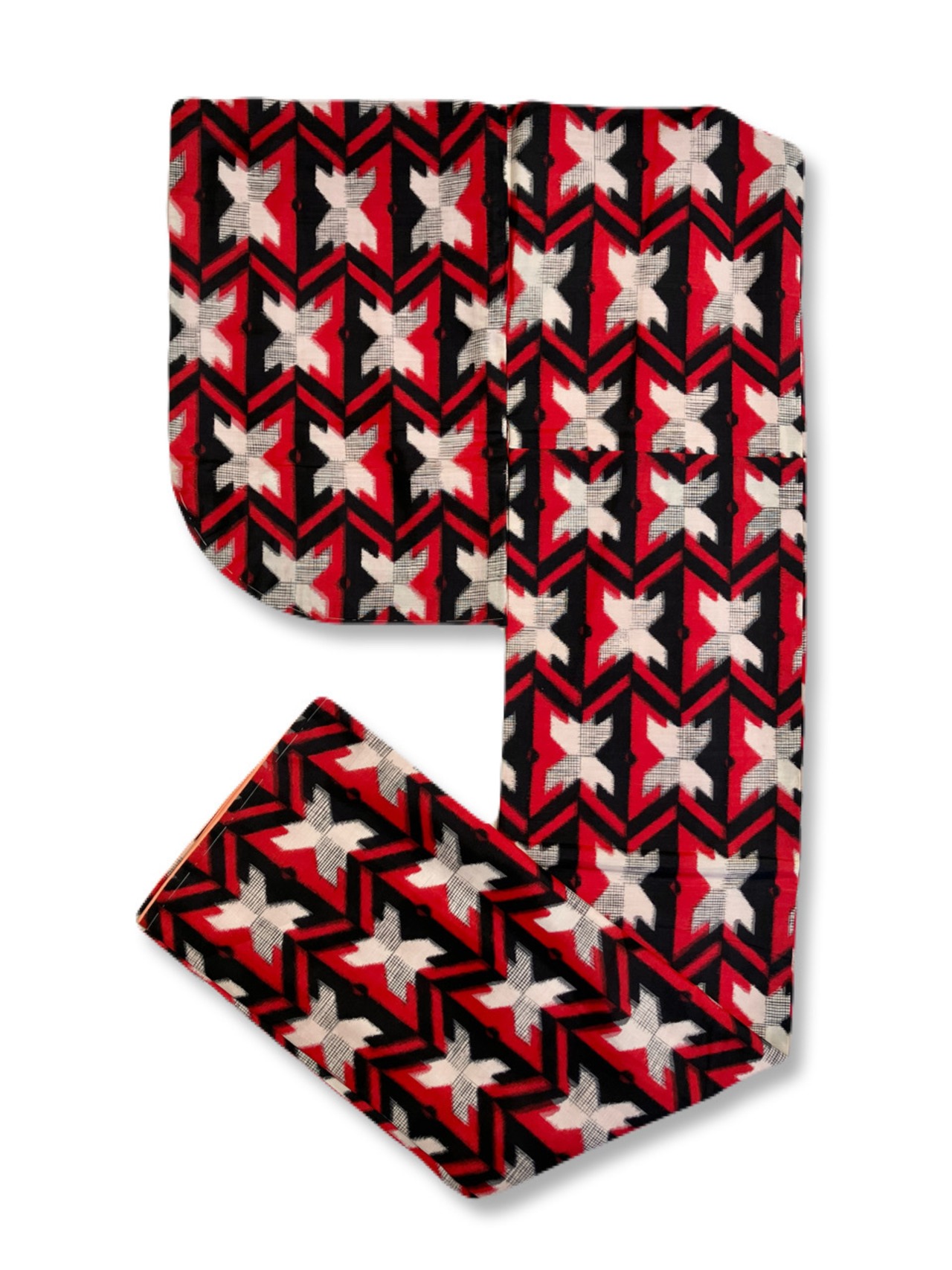 赤、黒、白の、千鳥格子やヘリンボーン柄をミックスさせたようなモダンパターン