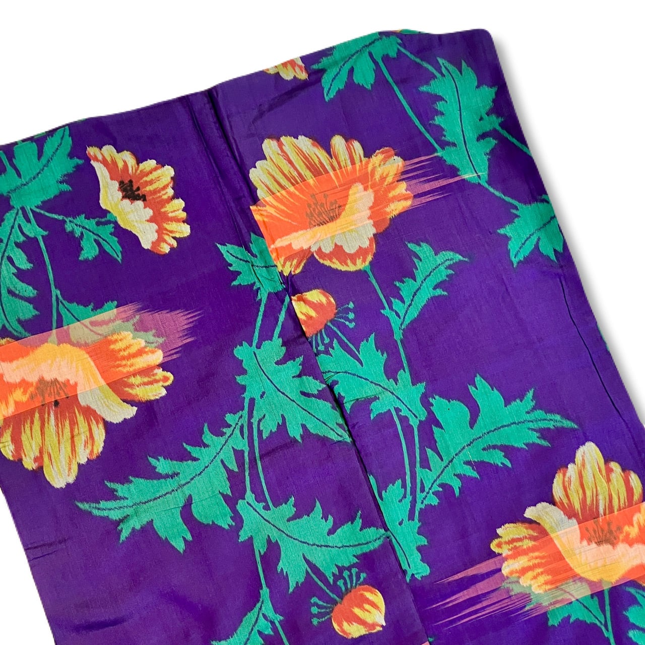 濃い青紫の地に伸びやかな葉とオレンジ色のポピーの花