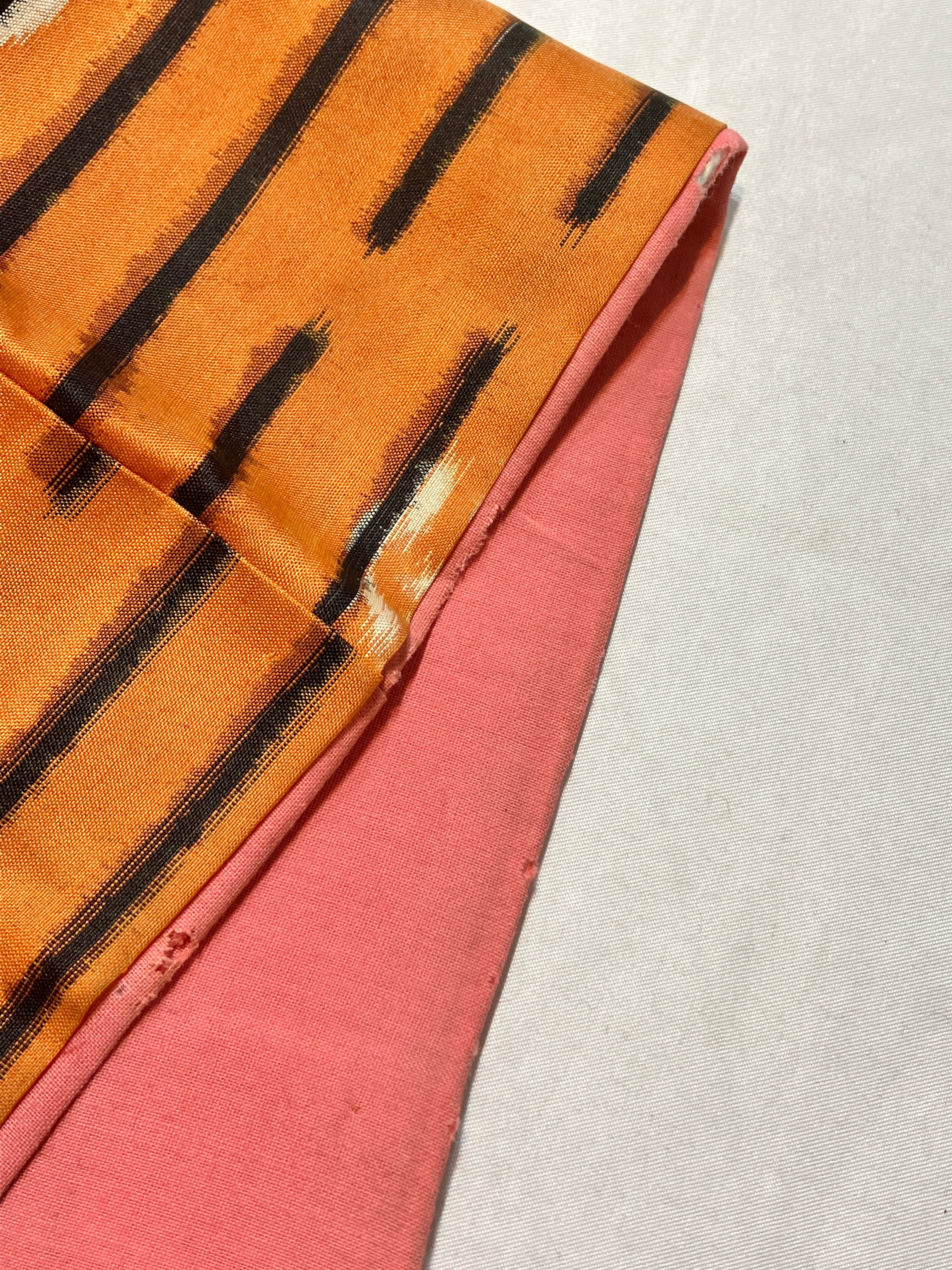 はっきりとした色味とモダンな柄、薄手ながらしっかりとしたハリが特徴の併用銘仙です。