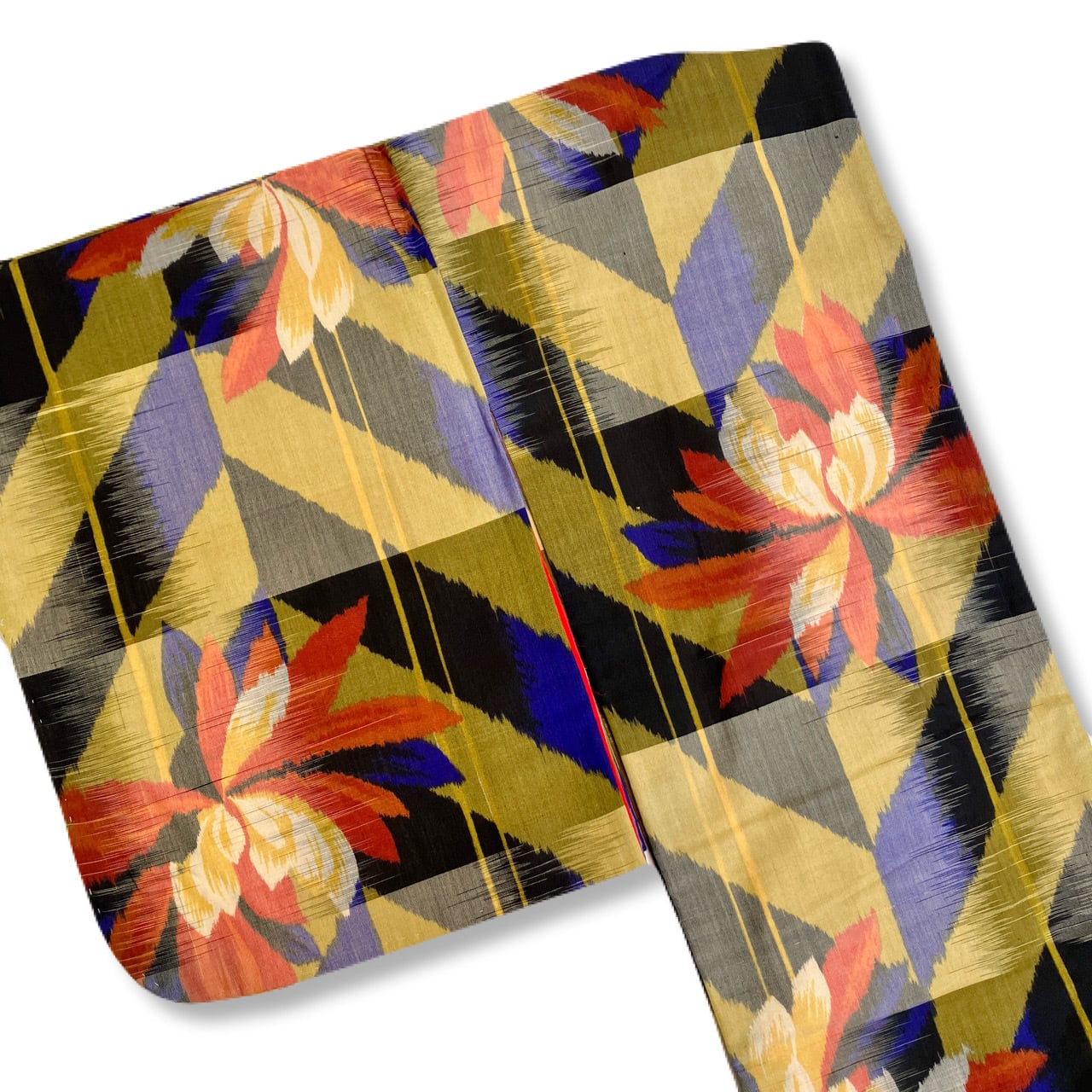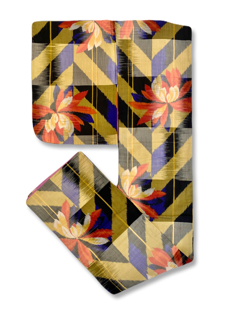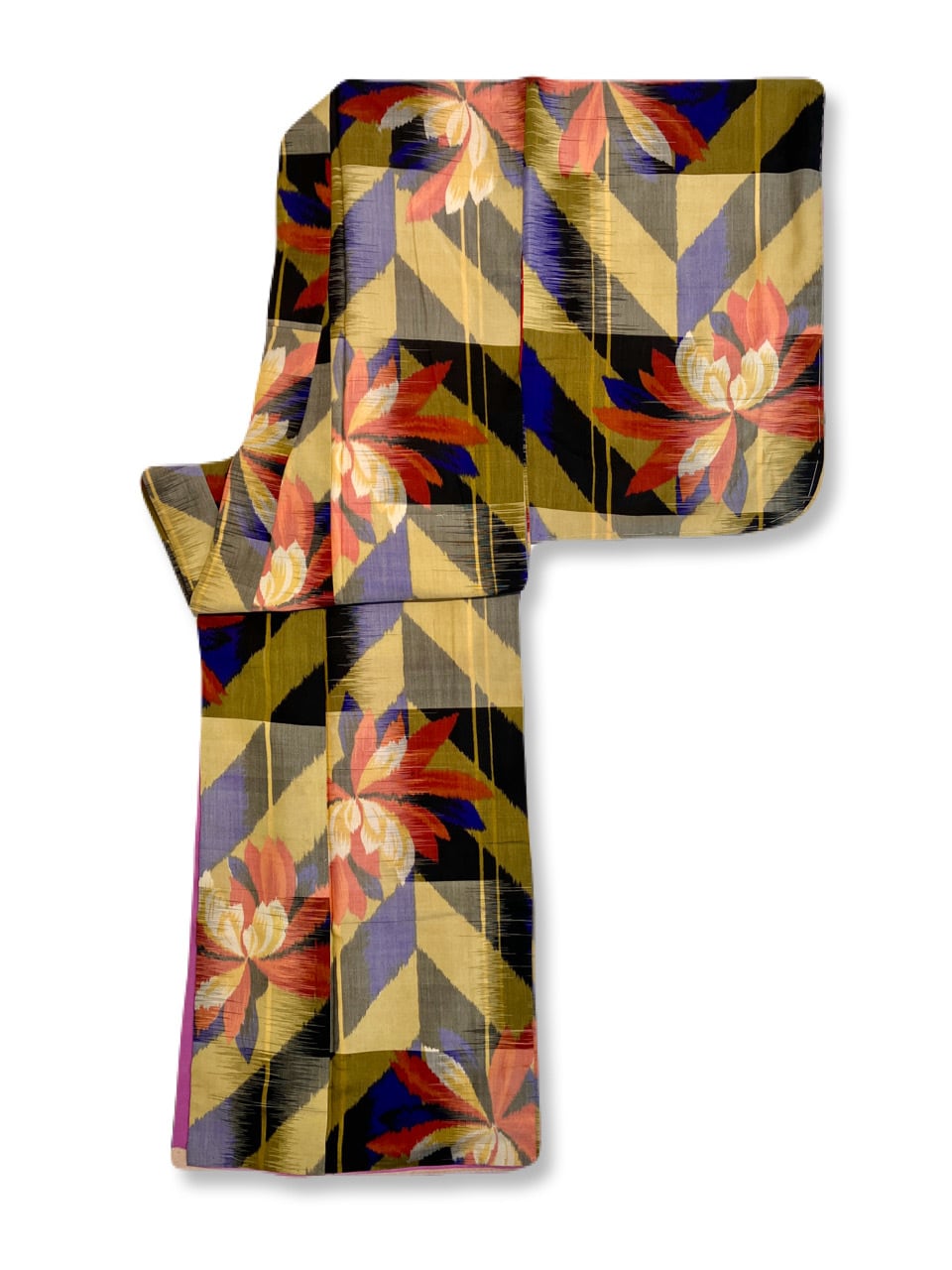 くすんだ黄色と黒のヘリンボーンや変わり矢羽根のような地に、大きな菊やダリアのような花。部分的に入る深いコバルトブルーも綺麗です