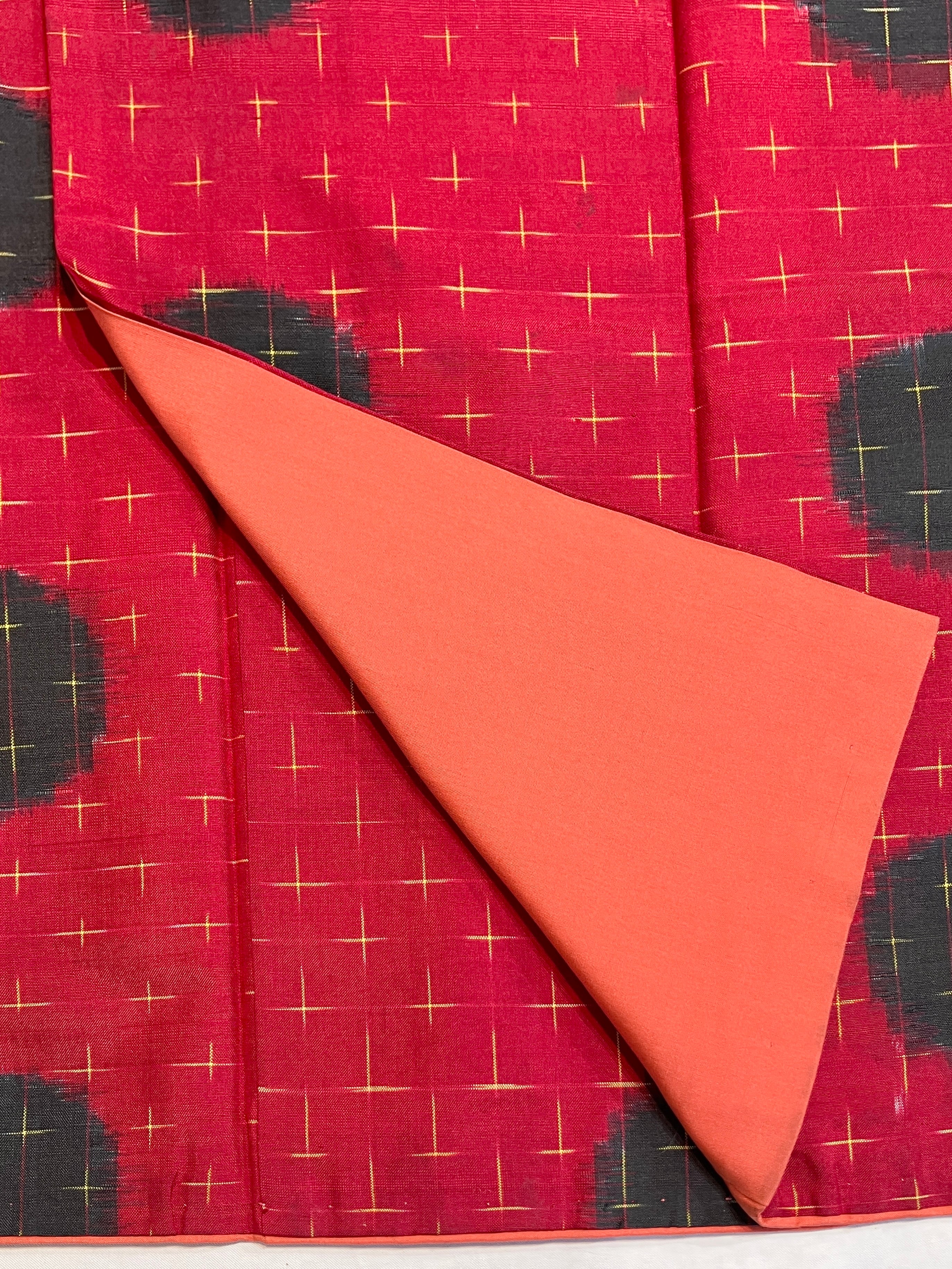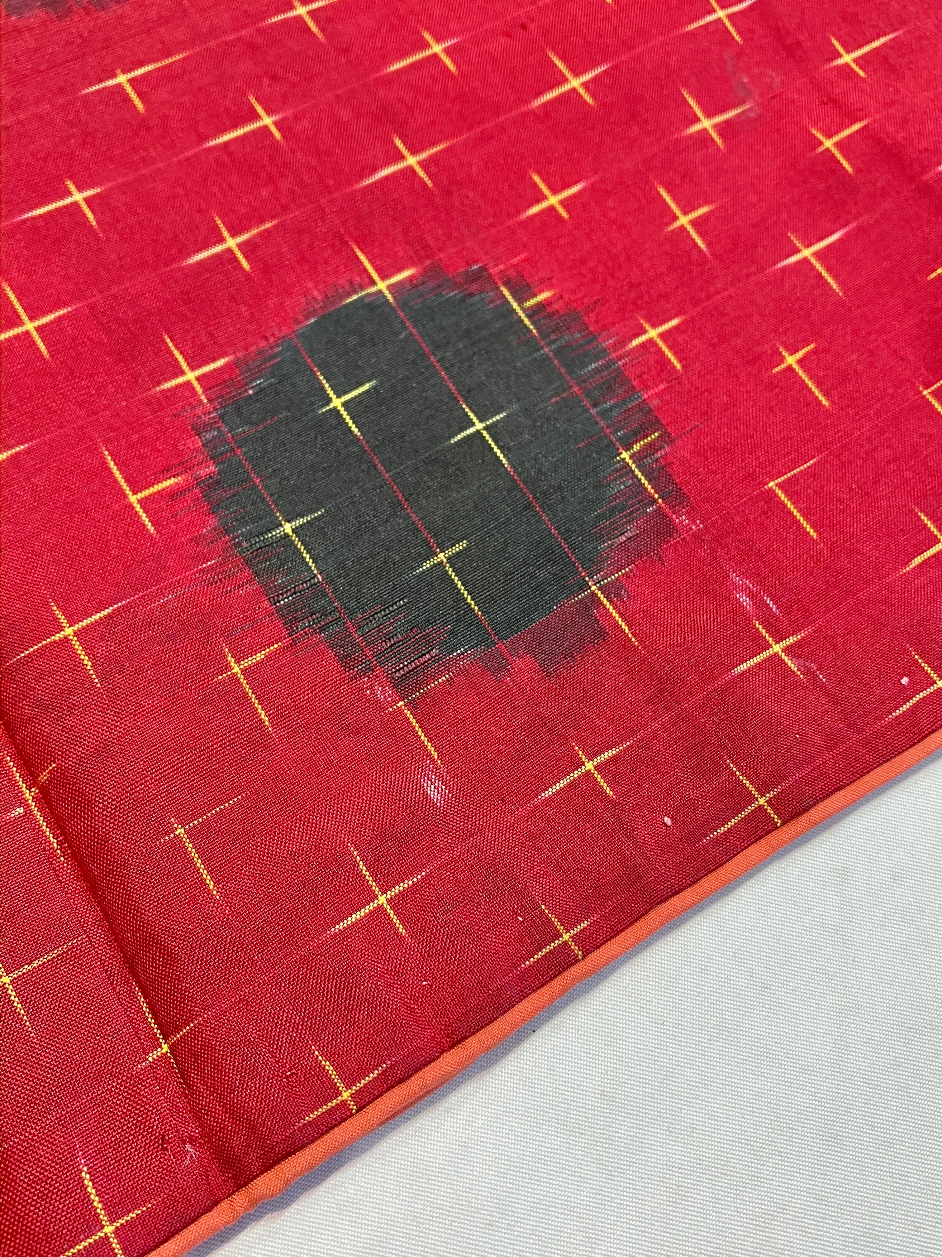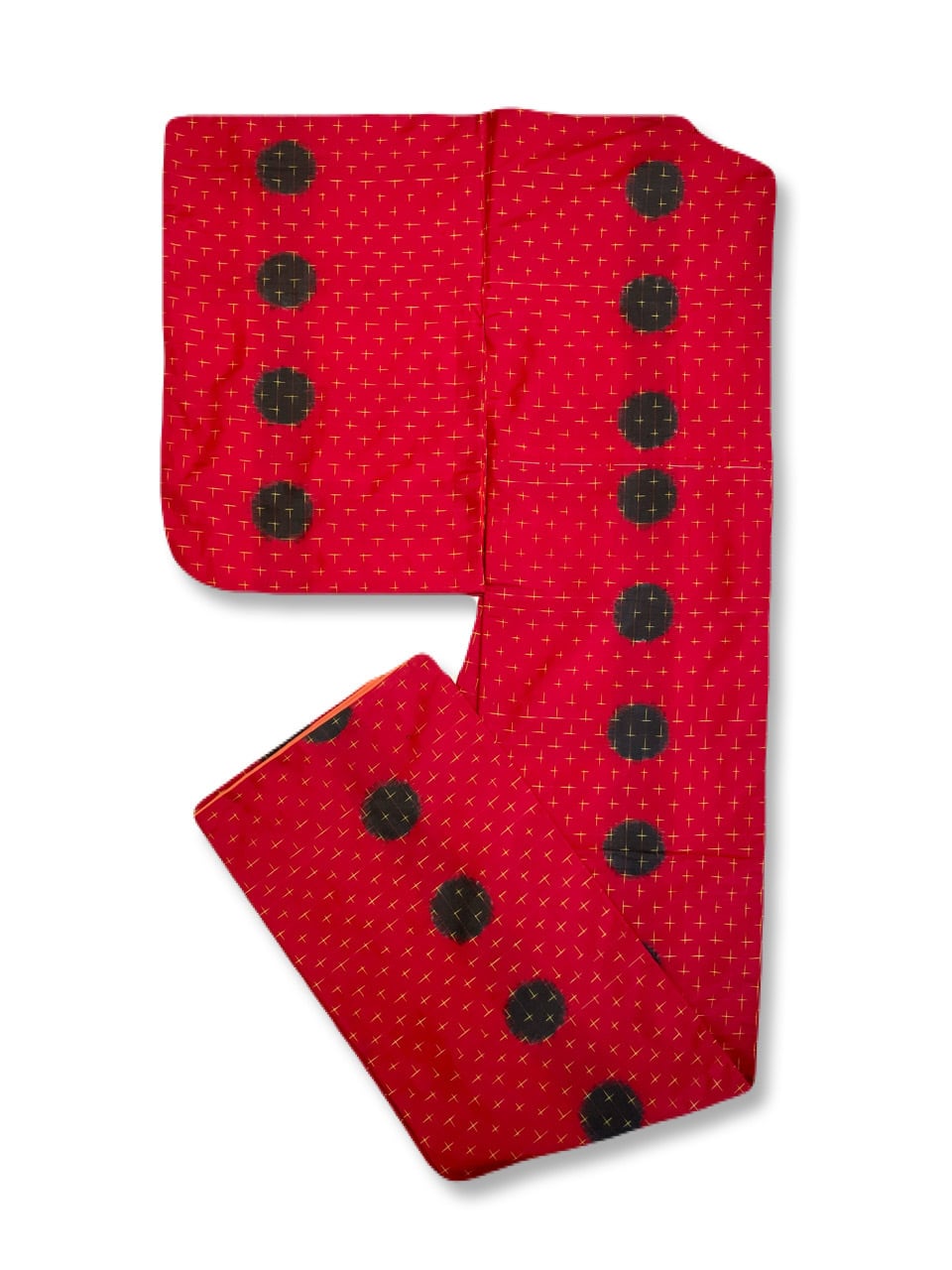 カーディナルレッド(濃く深みのある赤色)の地に黄色の十字絣に黒い大きなドット