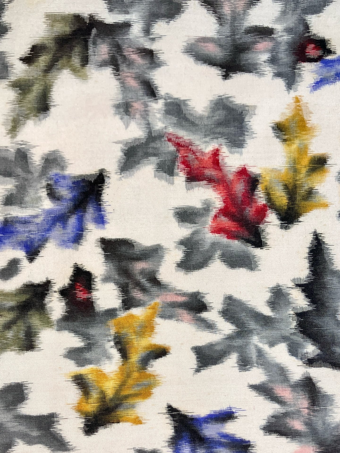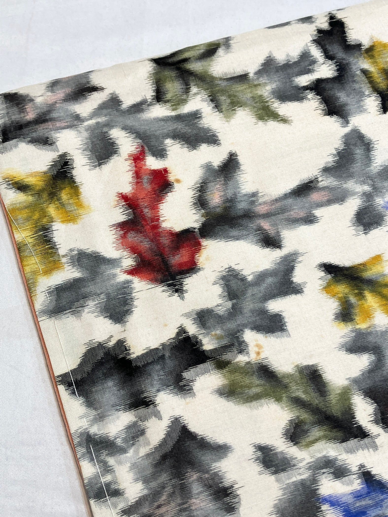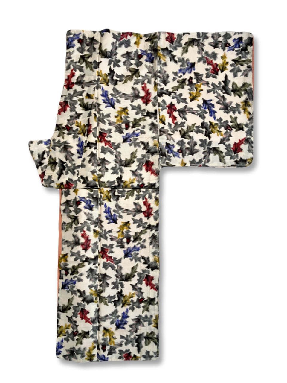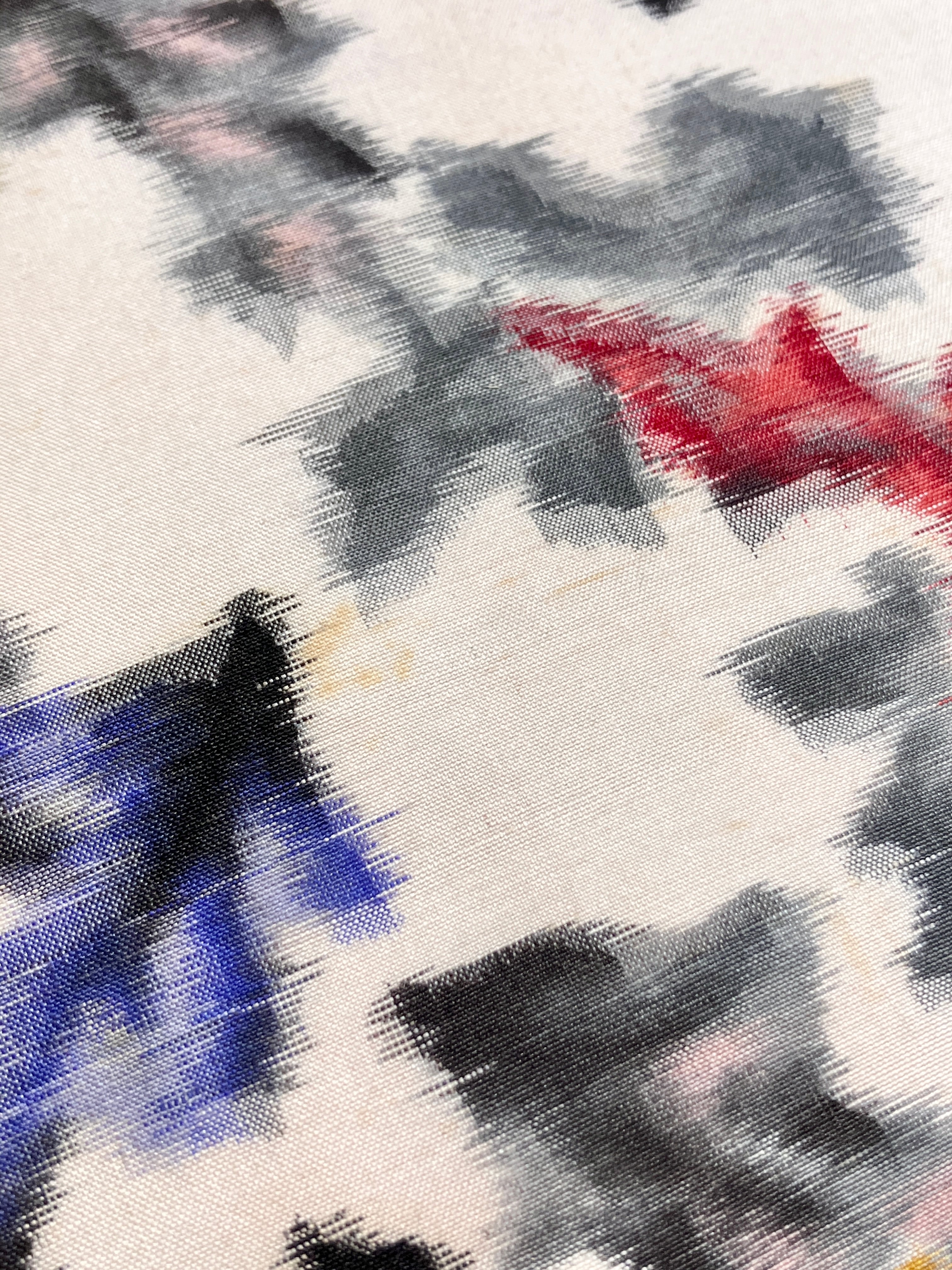 はっきりとした色味とモダンな柄、薄手ながらしっかりとしたハリが特徴の併用銘仙です。