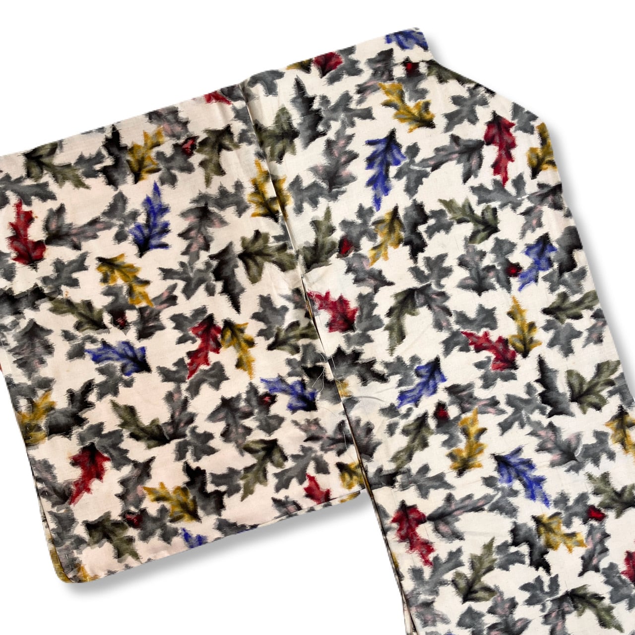アイボリーの地にグレーベースに赤、青、黄、緑のカラフルな葉が混ざった柊