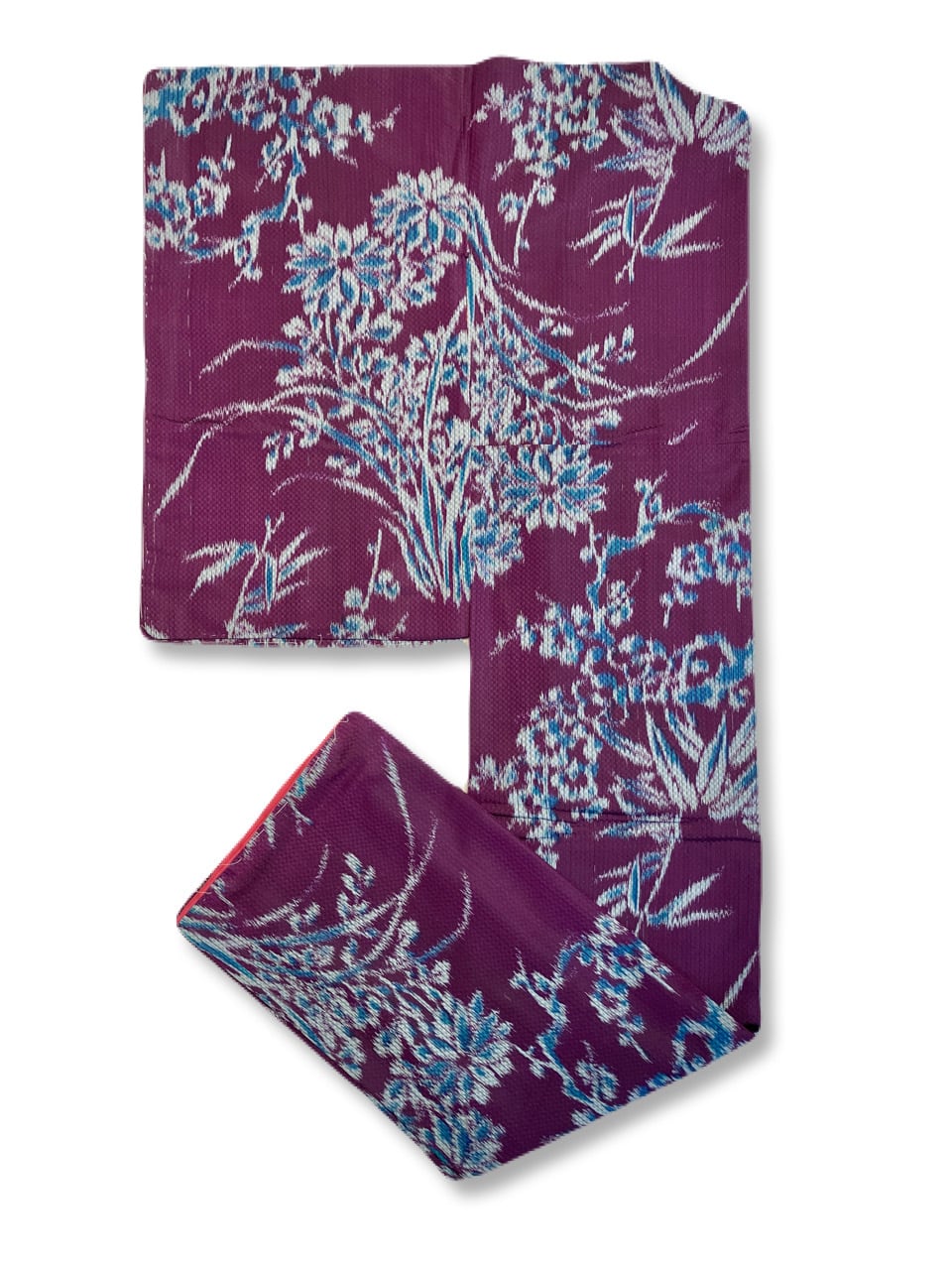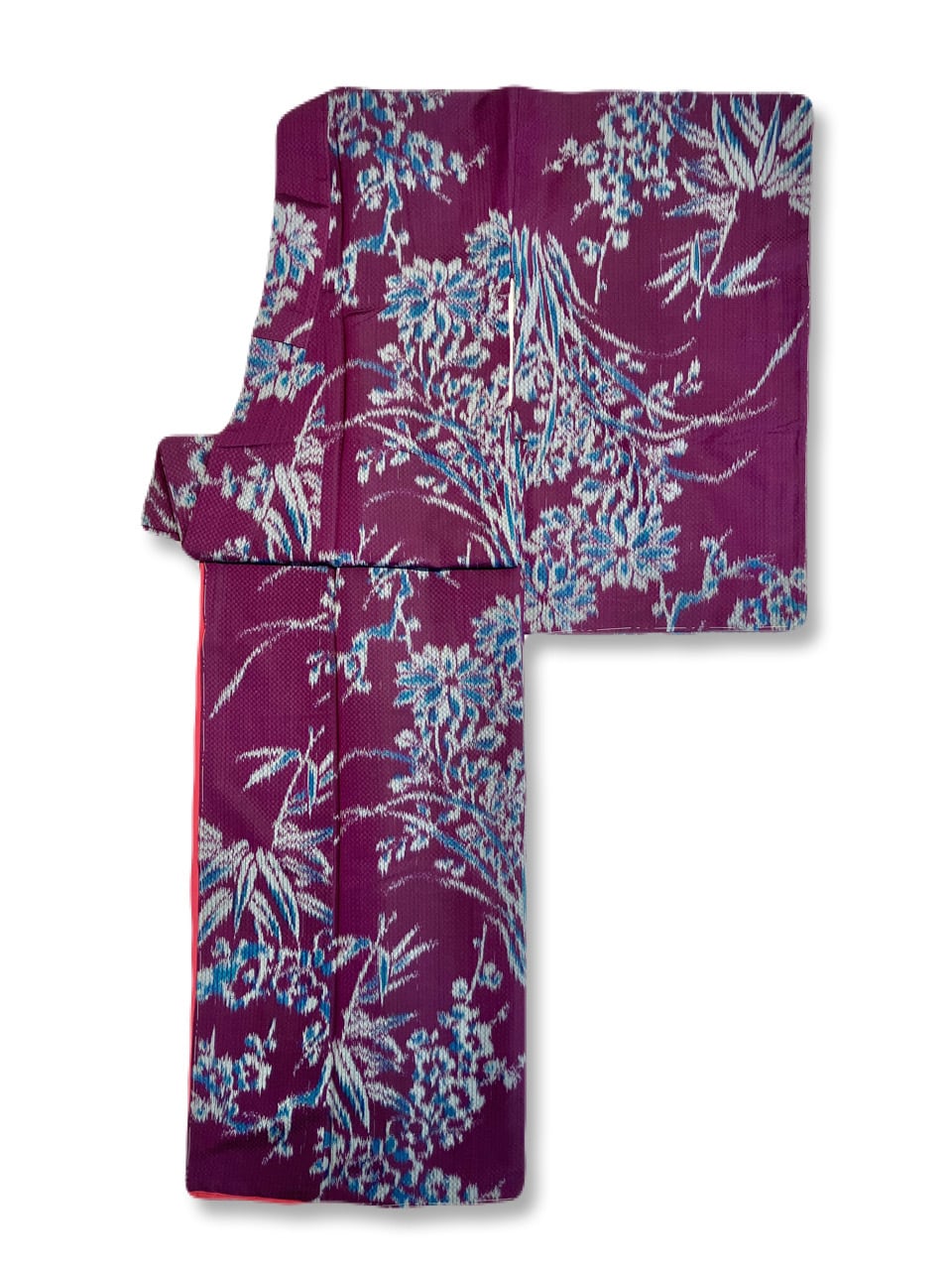 葡萄色の地にグレーと青の菊や枝梅や笹