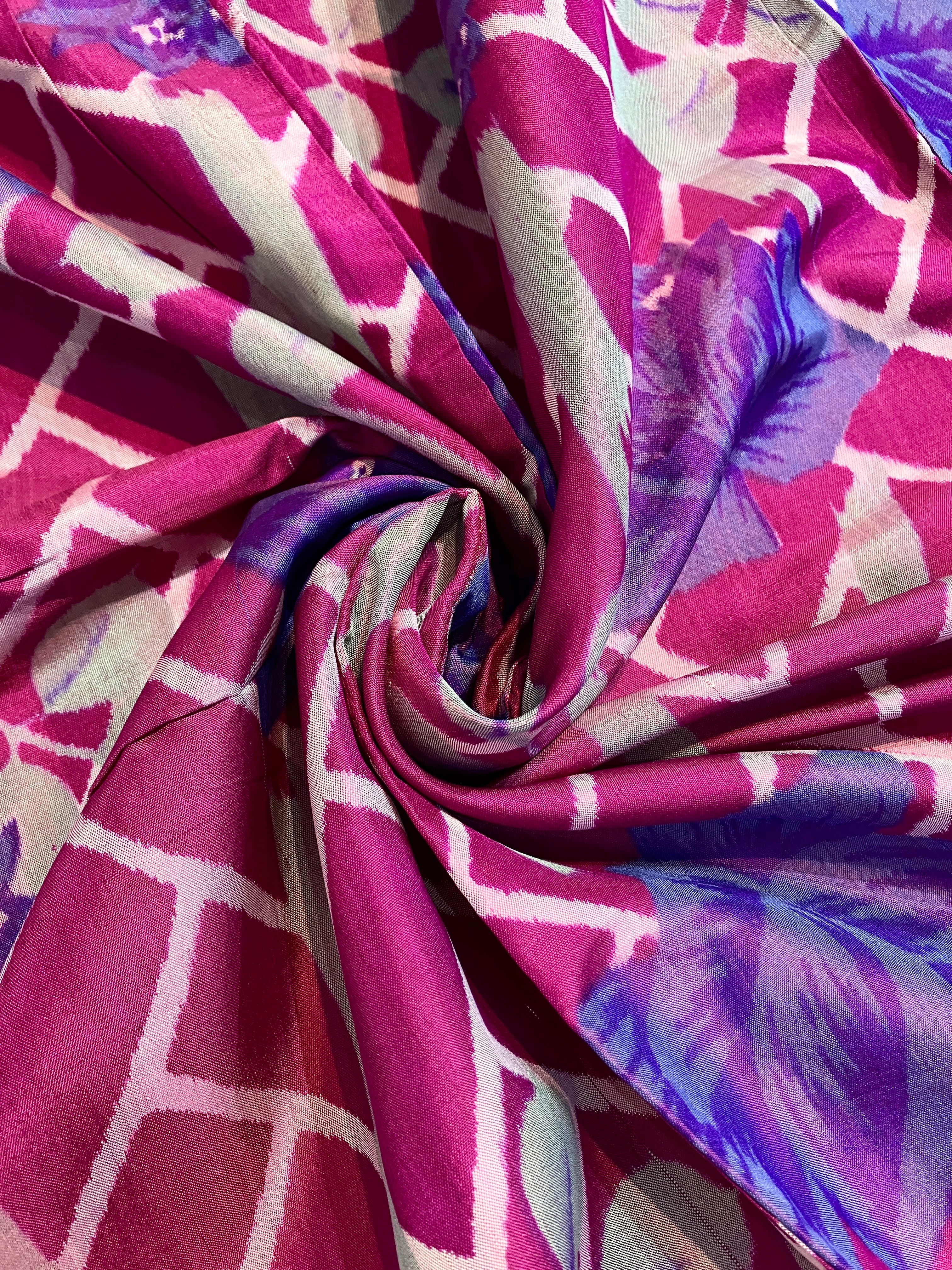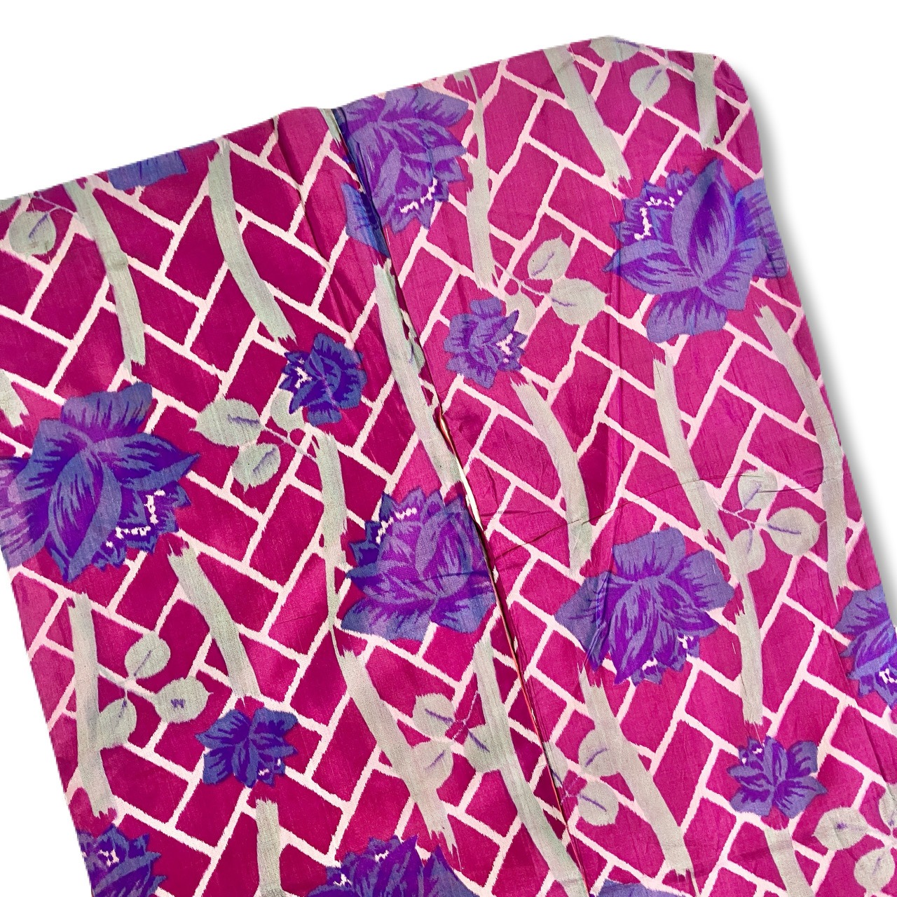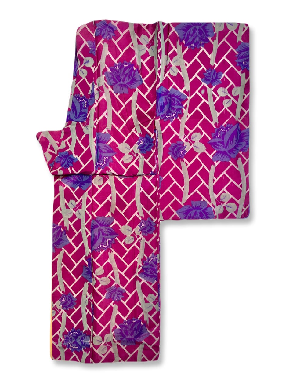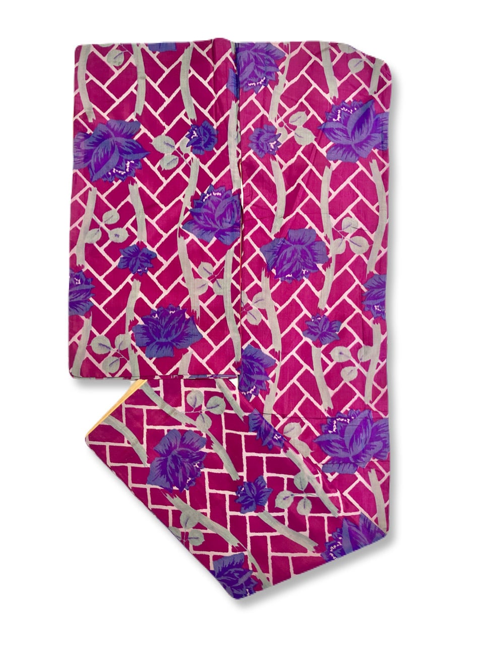 深みのあるラズベリー色(赤寄りの紫)の地にレンガのような檜垣と青いバラ。バラの茎は立涌のよう。