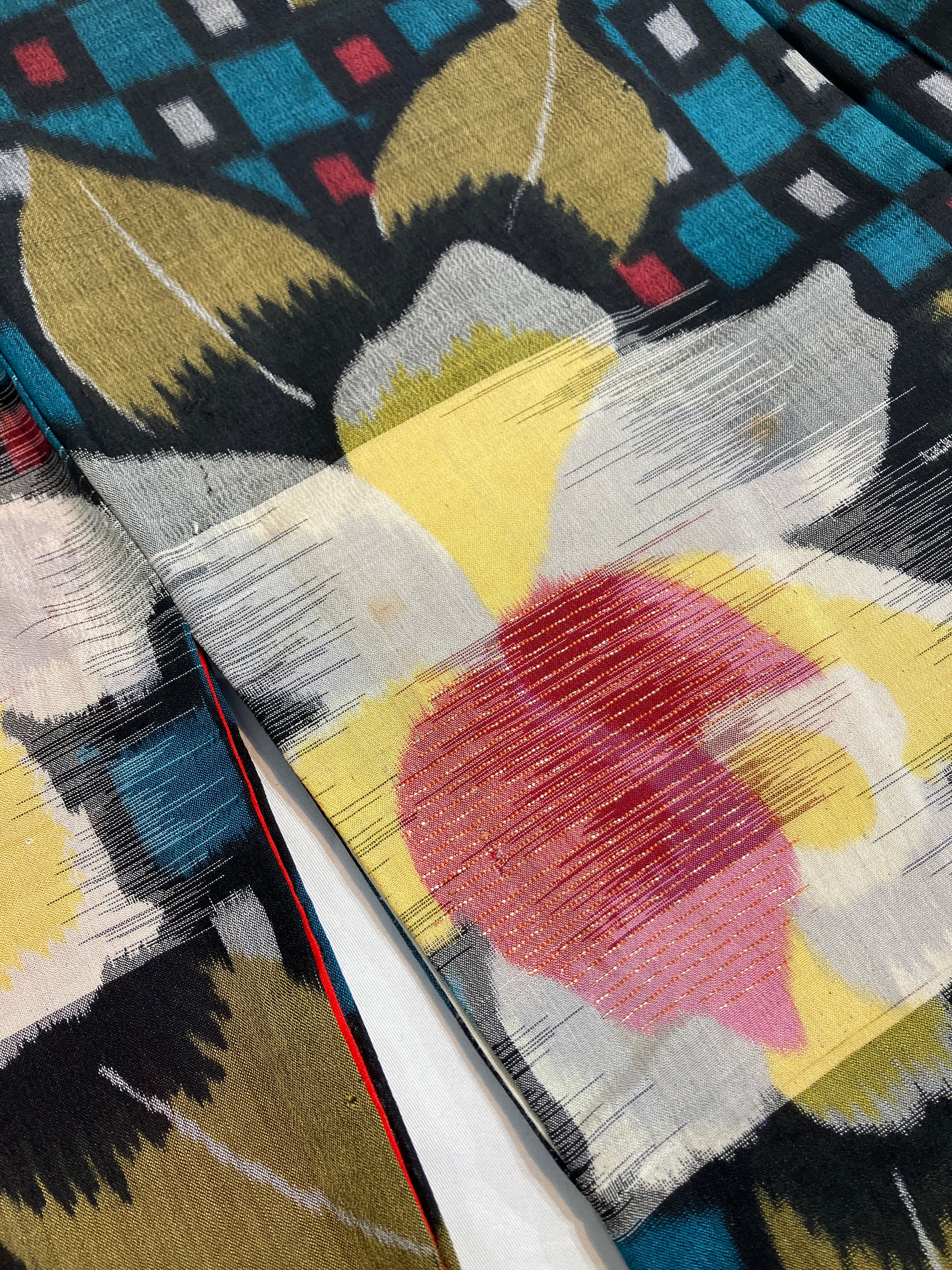 薄手で柔らかく落ち感もあり、部分的に入る明るい横糸により柄に動きが出る半併用銘仙です。