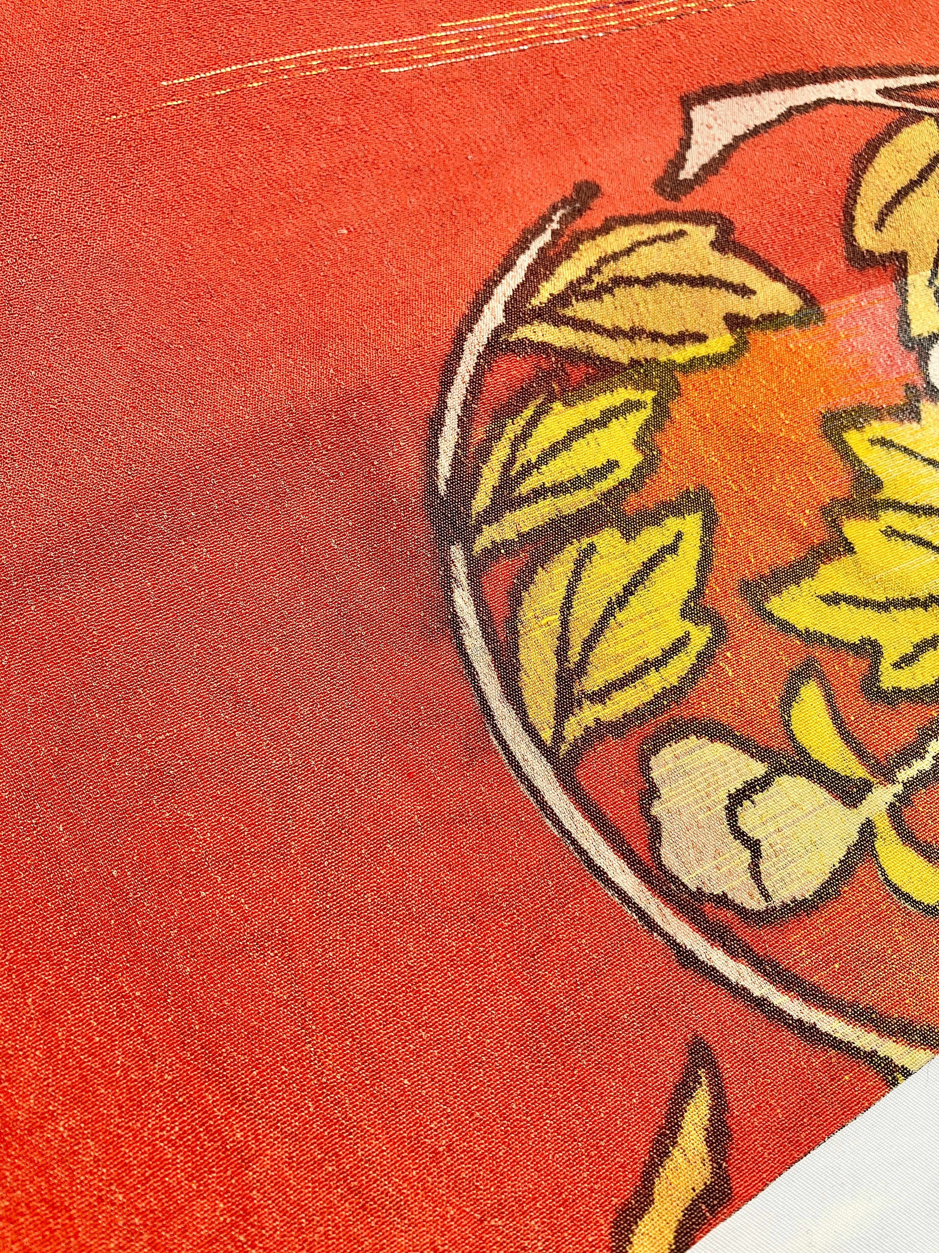 キャロットオレンジ(やや赤みのオレンジ)の地に椿と牡丹、楓の花丸紋