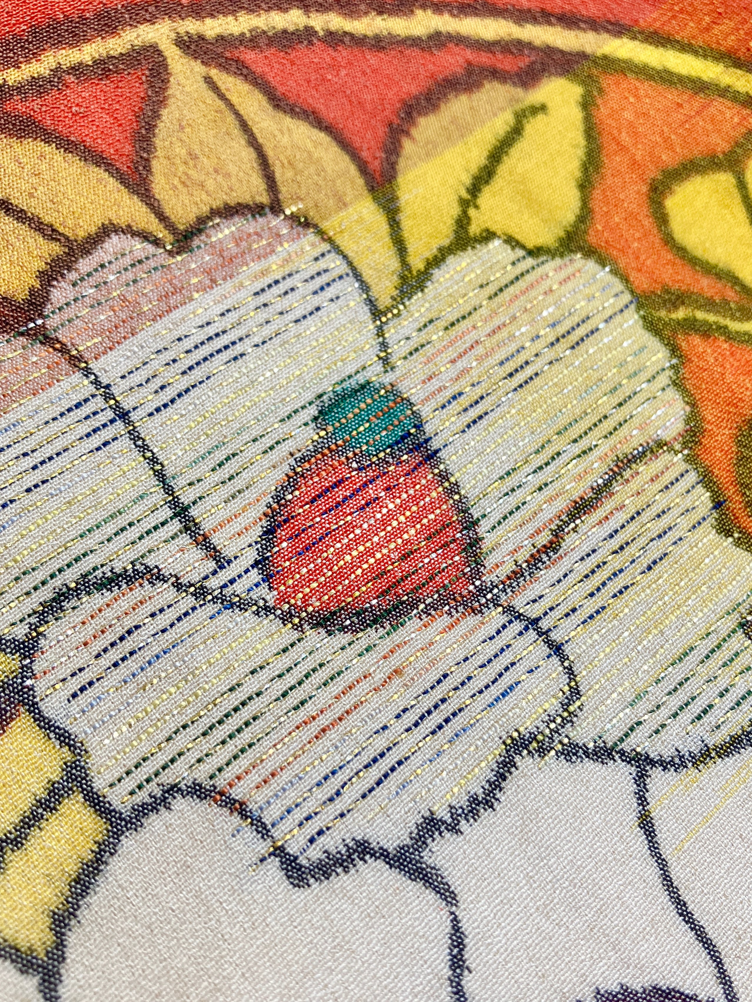 綺麗なオレンジ色に、お花には部分的に金糸とカラフルな糸が織り込まれていて素敵な銘仙です♪