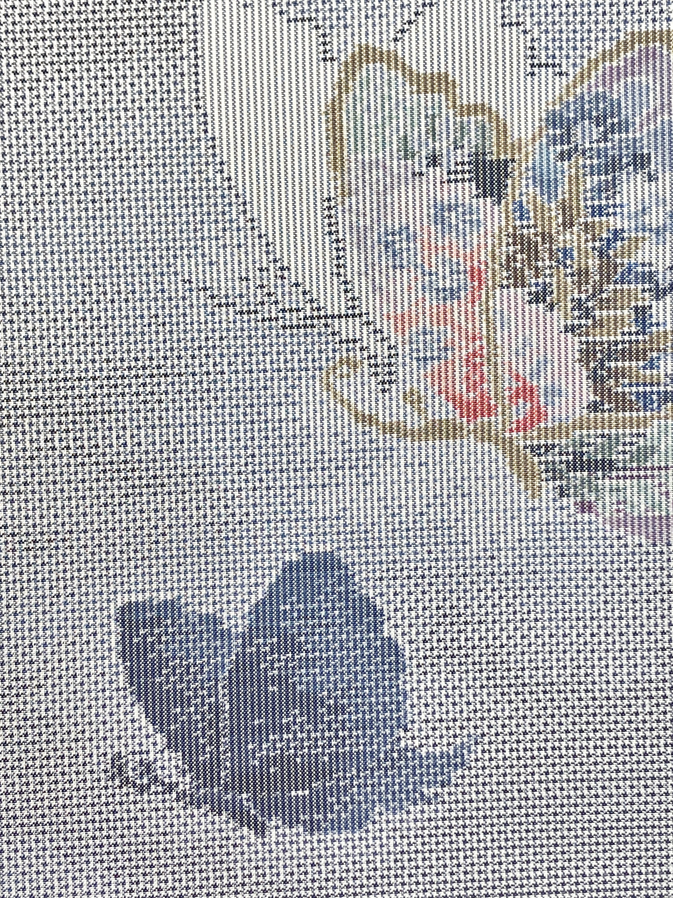 白とブルーグレーが細かな千鳥格子のように織り込まれた明るいグレーの地に、草花柄のカラフルな蝶々と暗めのブルーグレーの蝶々の紬の袷着物