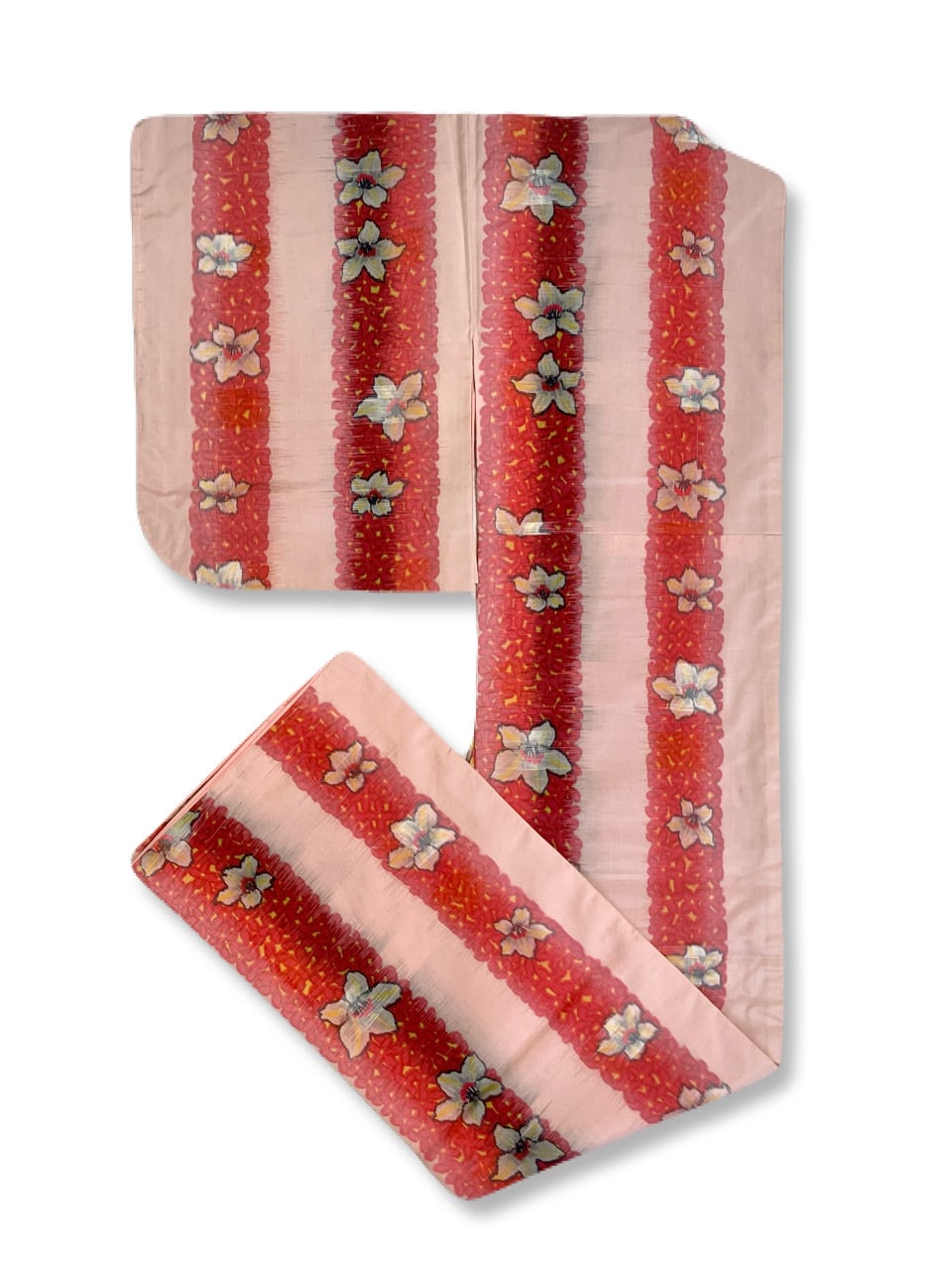 淡いピーチピンク(ややオレンジ寄りの明るいピンク)の地に、白いツツジの花と赤い小さなお花が密集した縞模様