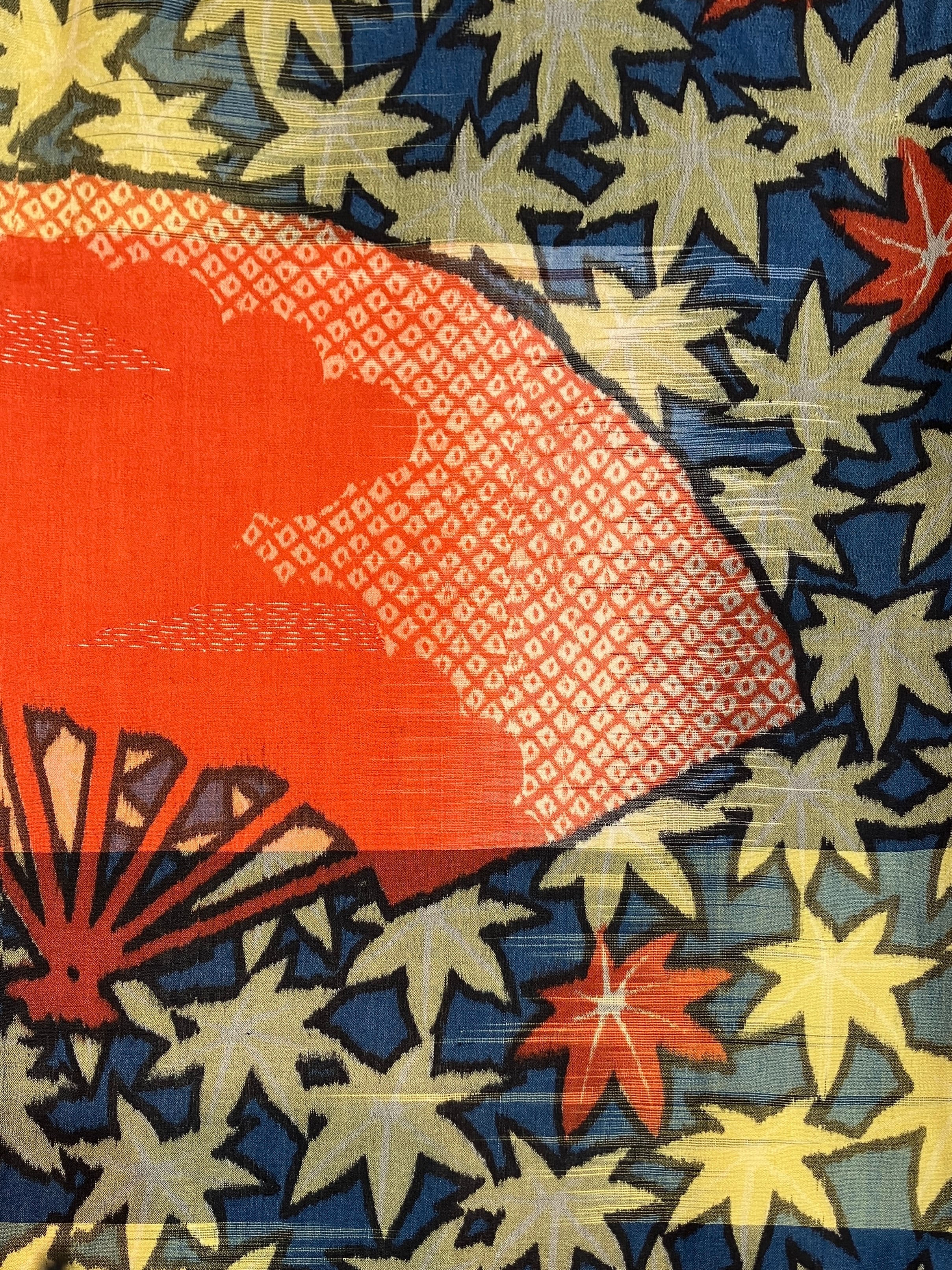 暗い青色の地に、薄黄色と朱色の紅葉と鮮やかな朱色の扇