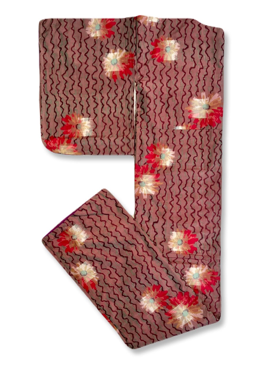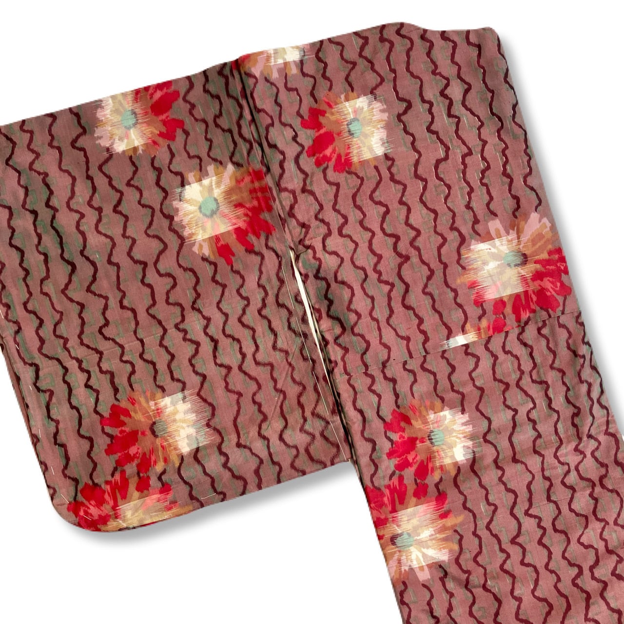 ココアブラウン(赤みのブラウン)の地にグリーングレーと濃いめのココアブラウンのジグザグラインと赤白ミックスのマーガレット