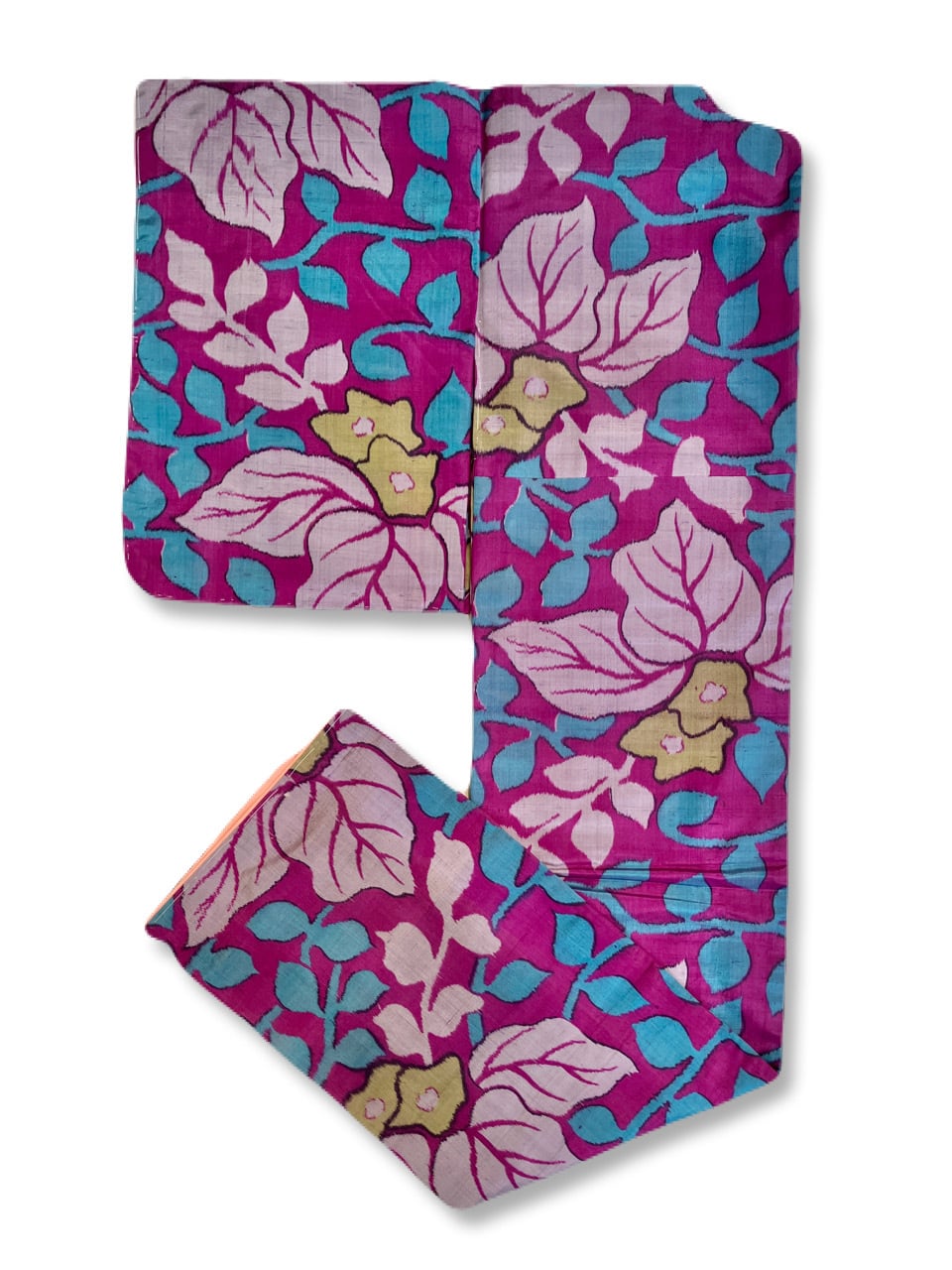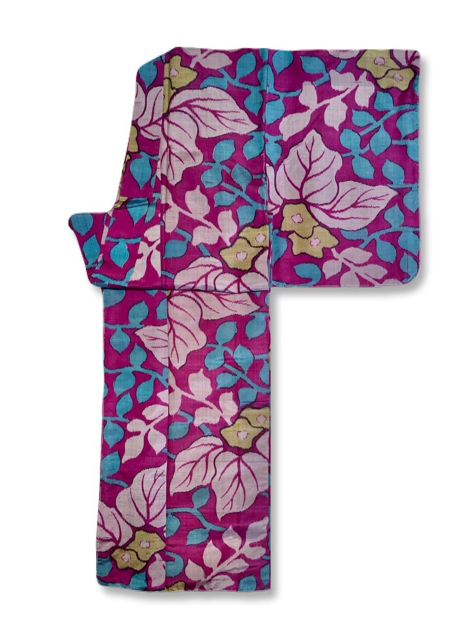 深みのあるフクシアパープル(赤みの紫色)の地に、薄い赤紫と水色の大きな2種の葉っぱとくすみイエローのお花