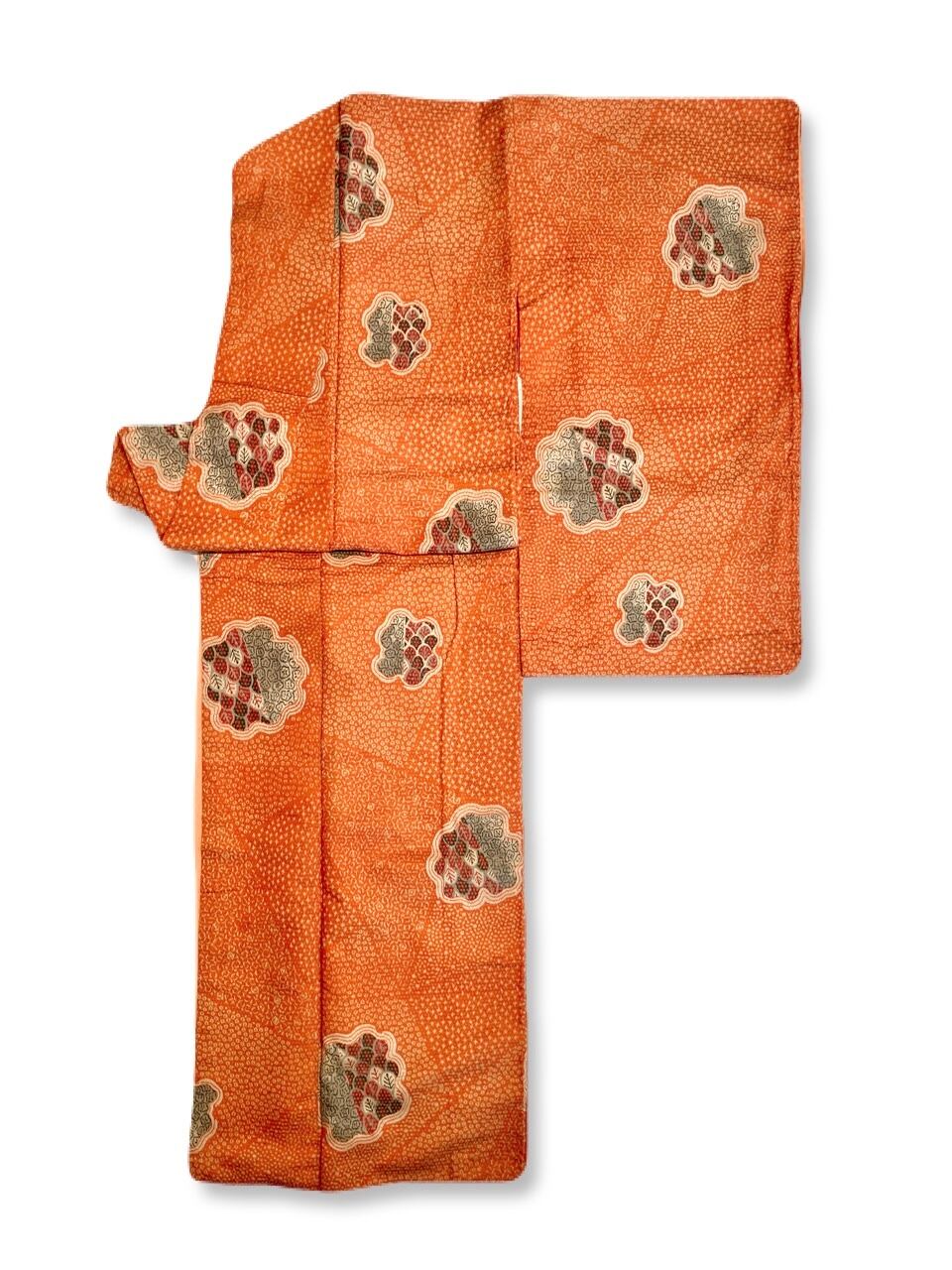オレンジ色の地に小さな四角形が並ぶ織柄に、淡いオレンジ色の鹿の子柄やダイヤ柄がパッチワークのような地模様に、ゆらゆらとした丸いフレームの中に赤黒白の葉っぱとグレーの小花