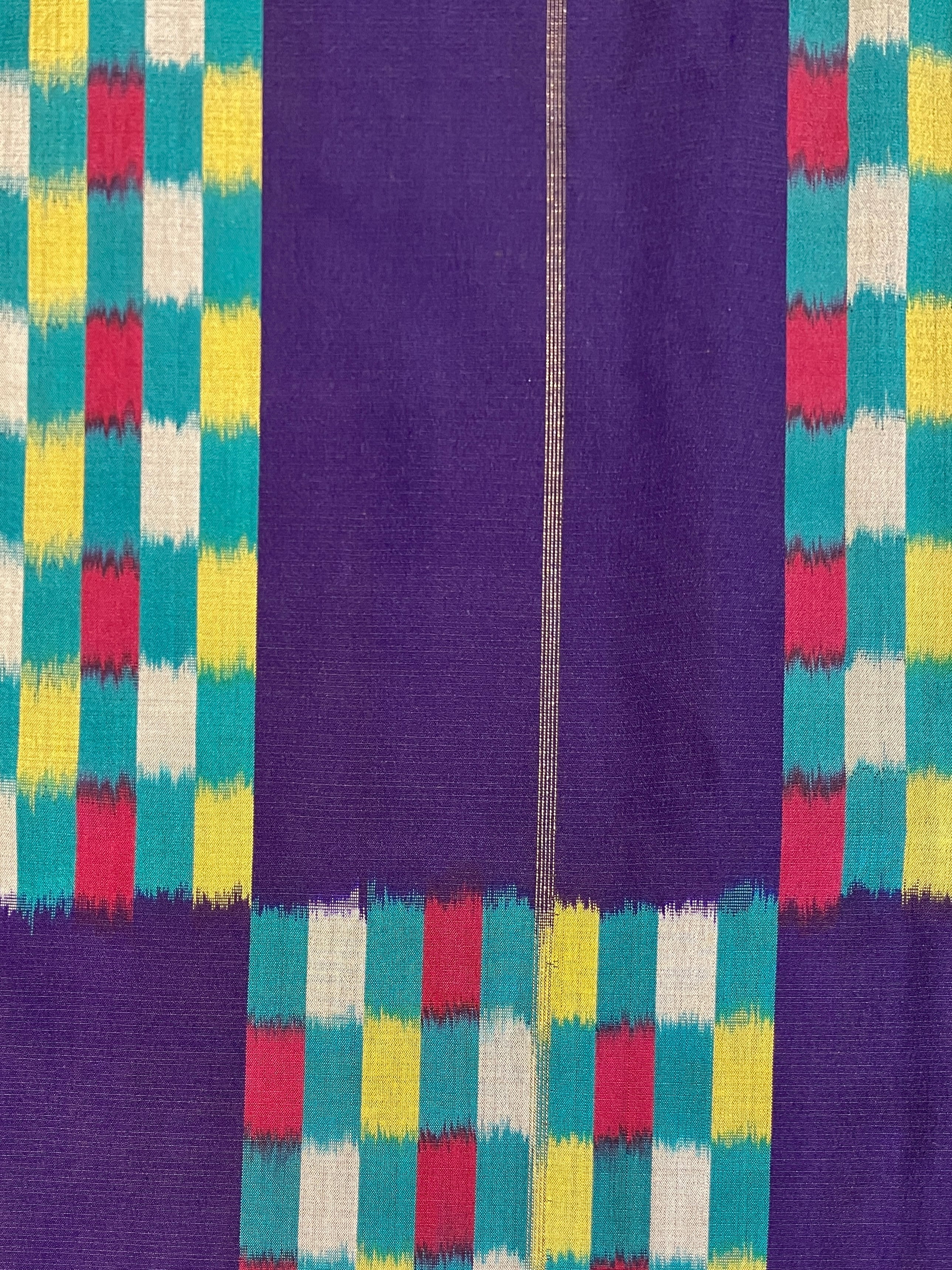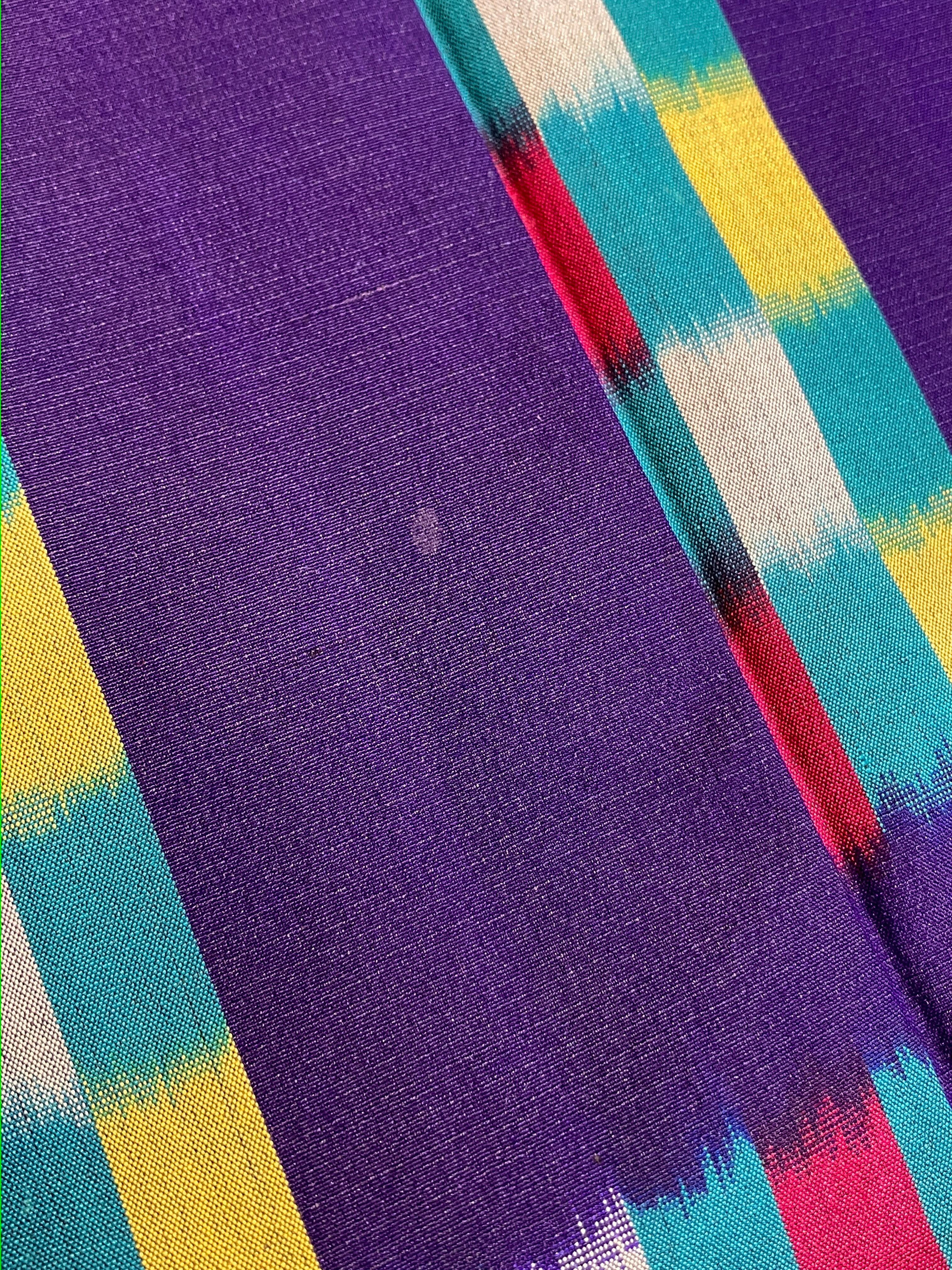 暗いバイオレット(青紫色)の地に、ダークカラーの青緑、赤、黄、灰色のカラフルな長方形の市松柄と、一部縦に金糸ラインがチラリ