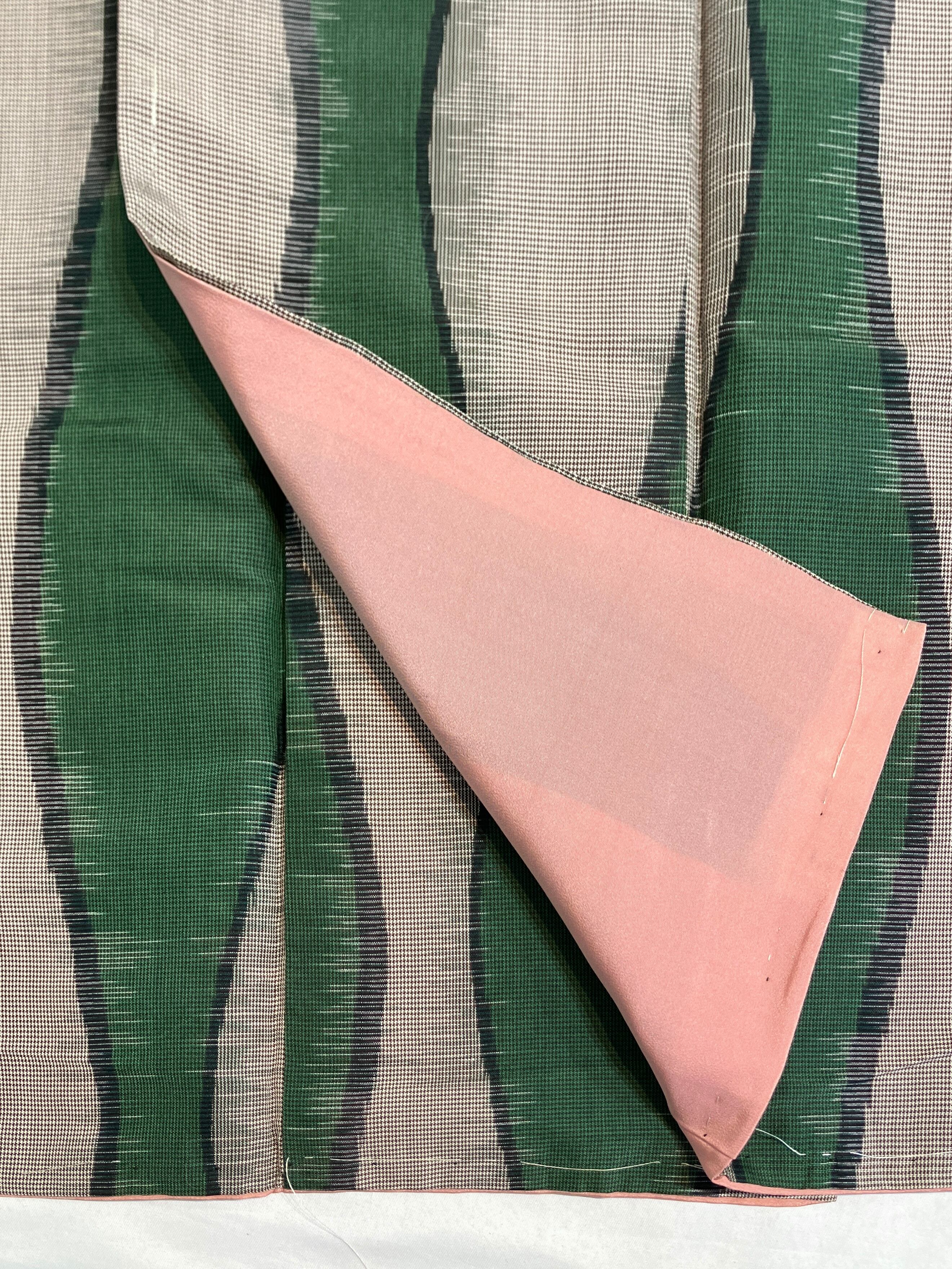 袷着物 紬 ダークグリーン×グレーベージュ 立涌