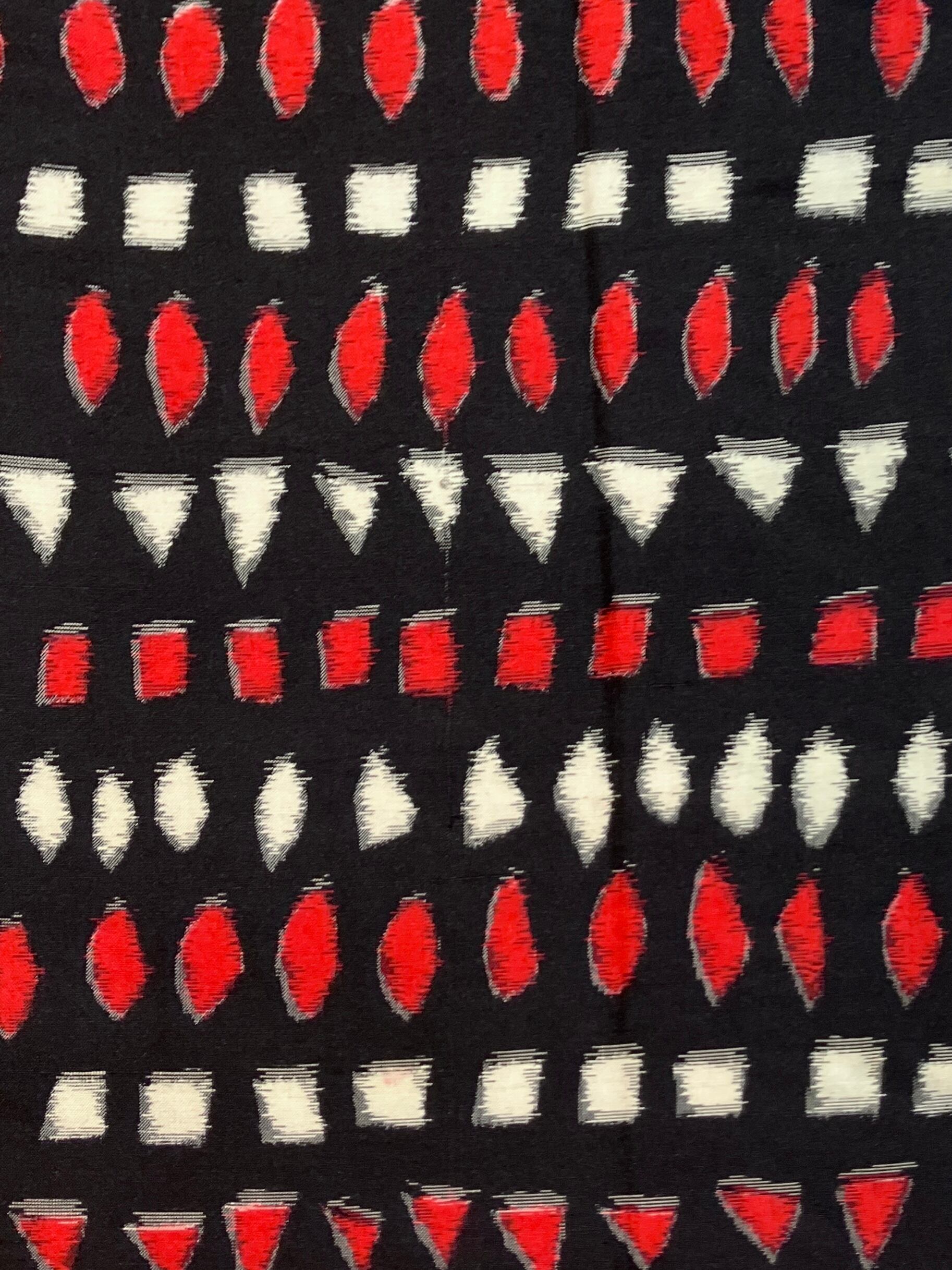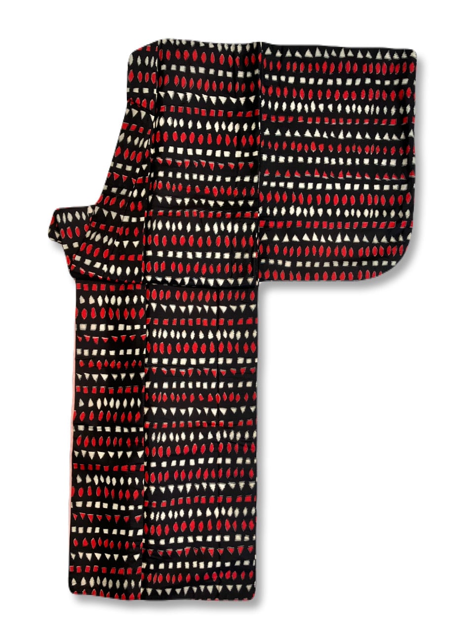 黒地に赤と白の三角、四角、リーフ型がボーダーのように並んだ柄