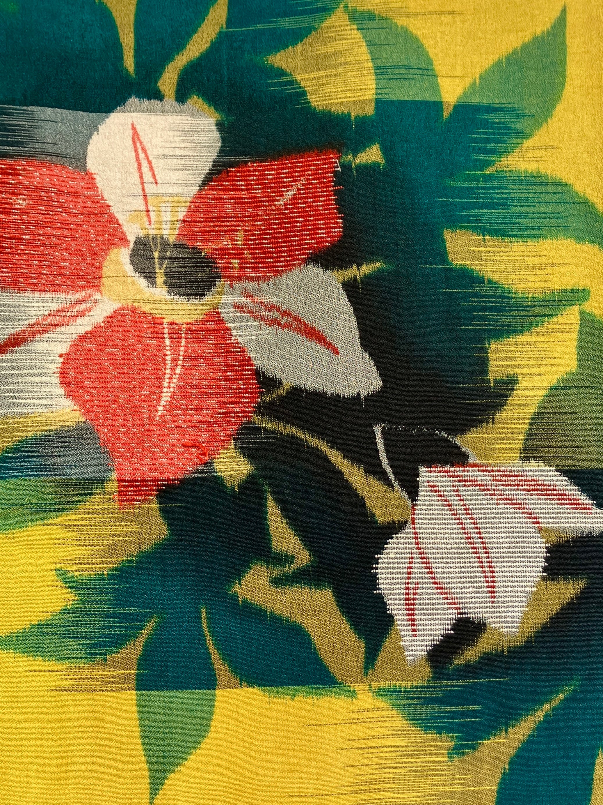 ほんのりくすみのある鮮やかな黄色の地に黒〜緑のぼかしの葉っぱと紅白の花弁の椿のような水仙のような不思議なお花。