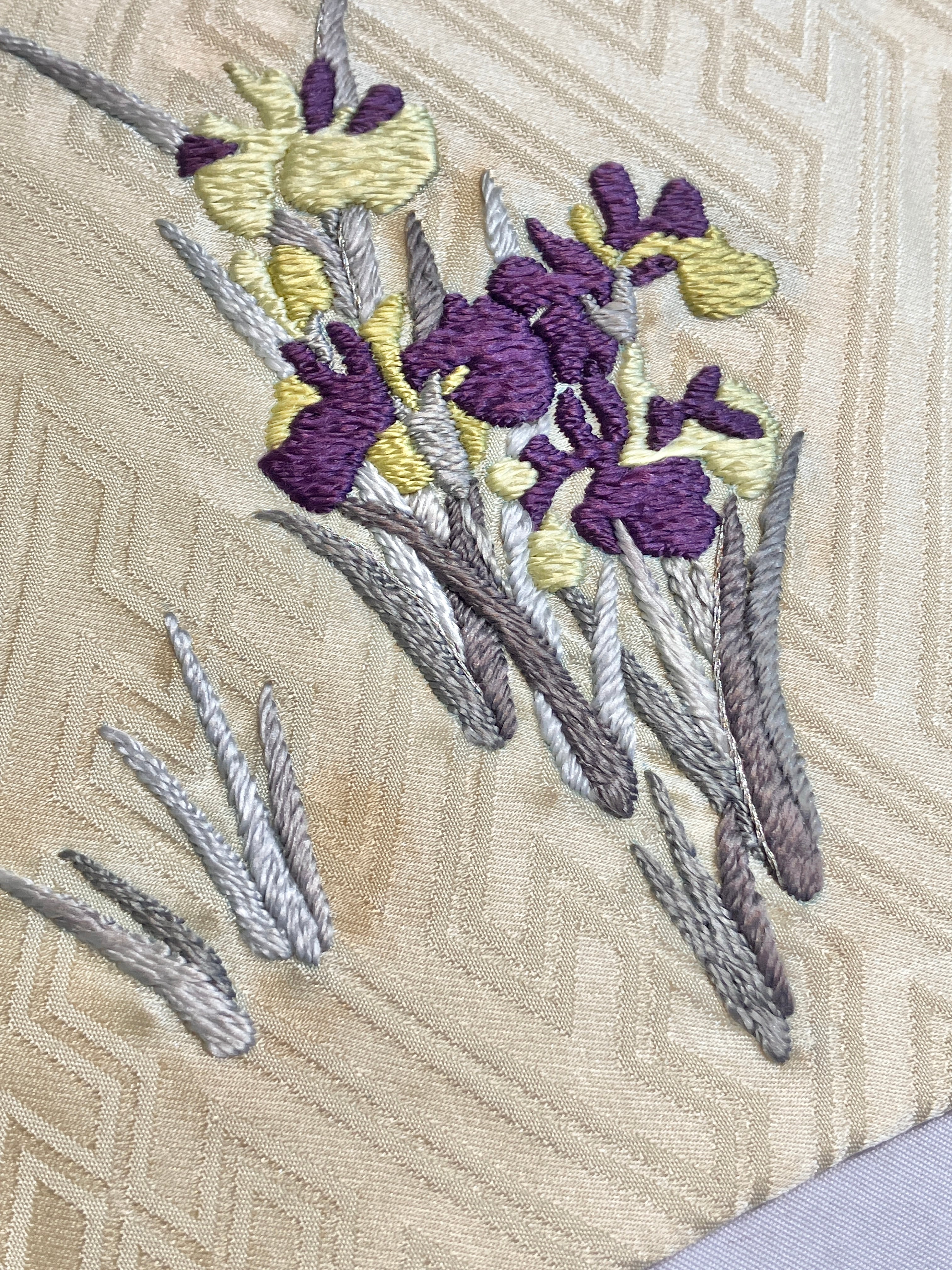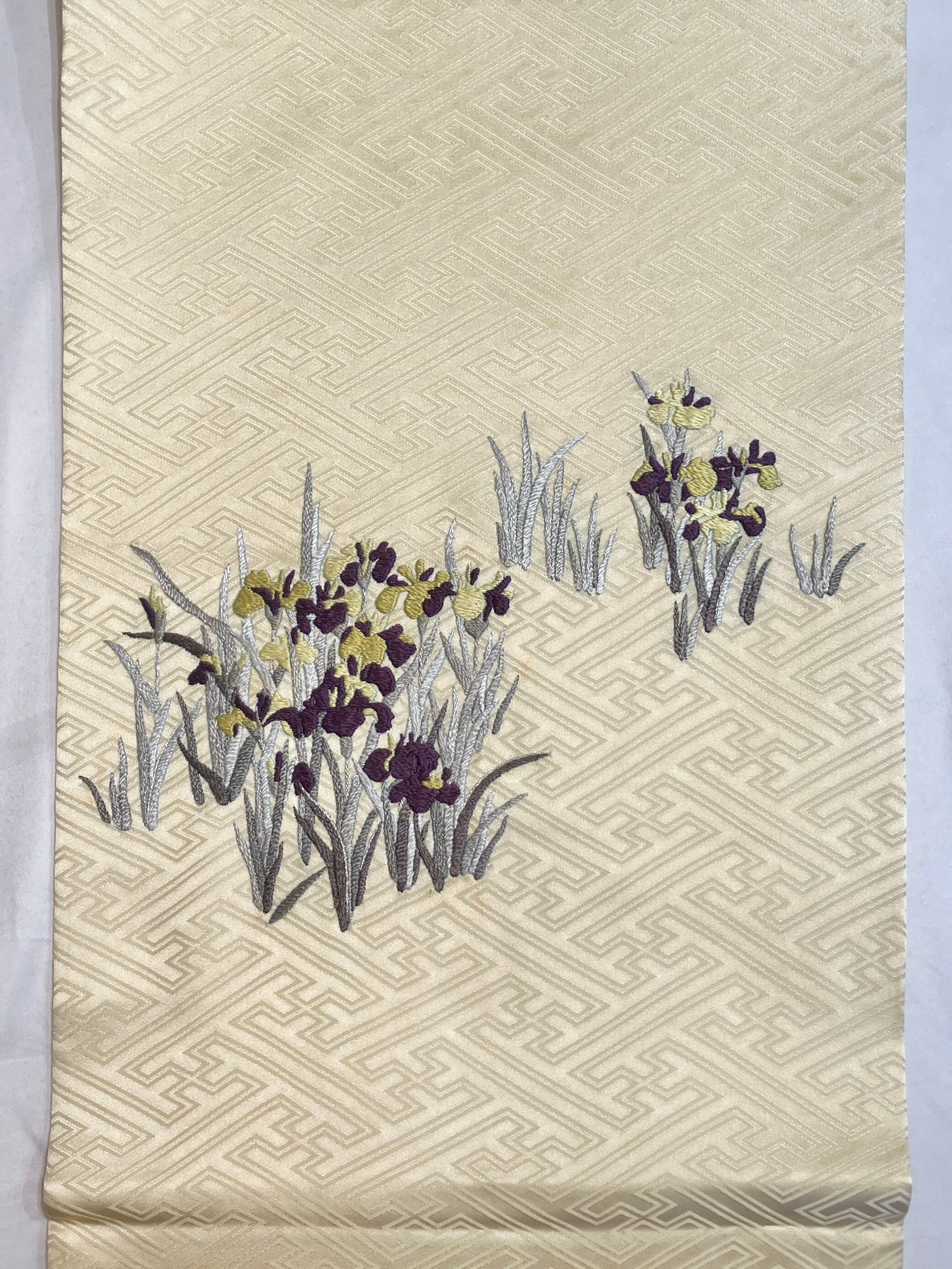 淡いクリーム色の紗綾紋の地にくすみカラーの菖蒲刺繍