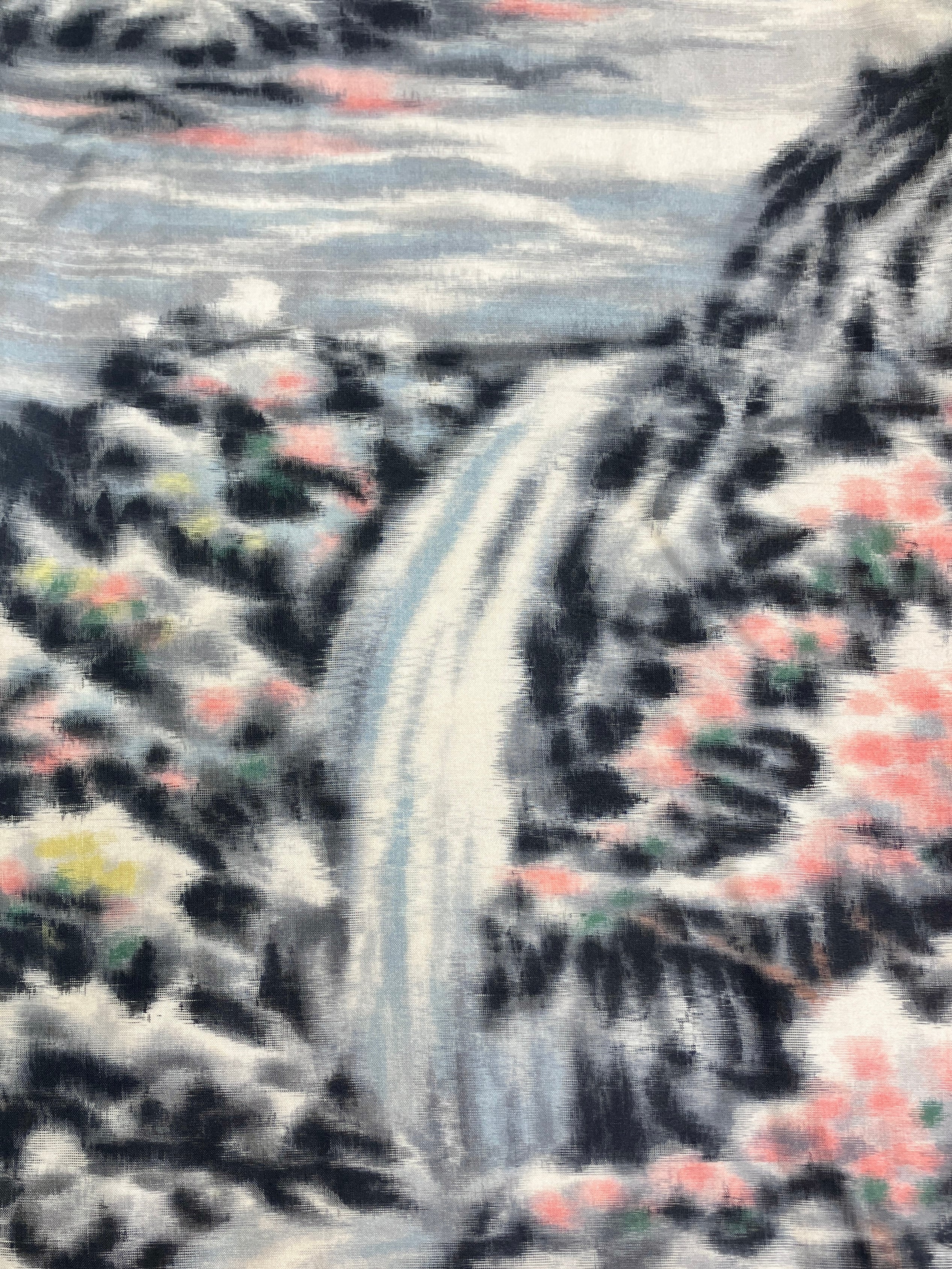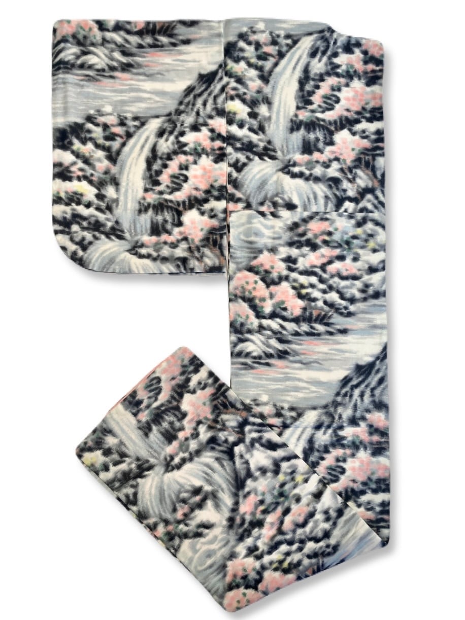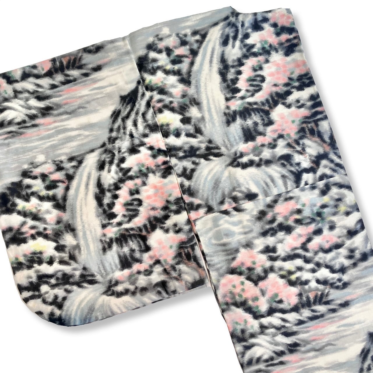 岩肌には桃色の山花が咲き誇り春の訪れを感じさせる日本画のような銘仙着物です。