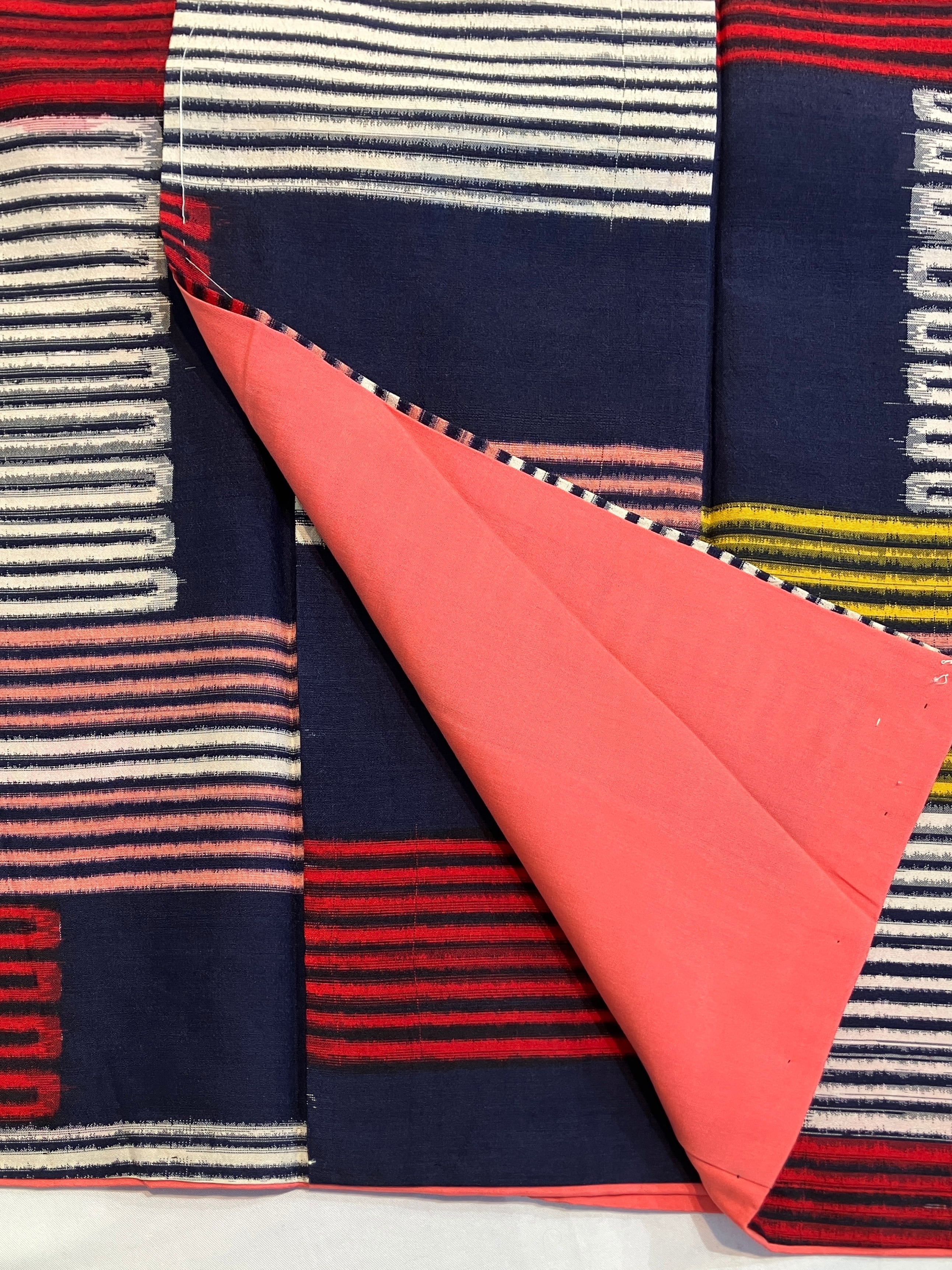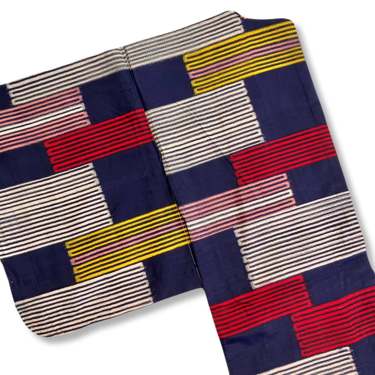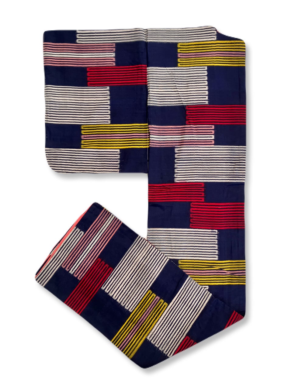 ネイビーの地に白や赤、ピンクや黄色のボーダーがブロックのように積み重なったモダン柄