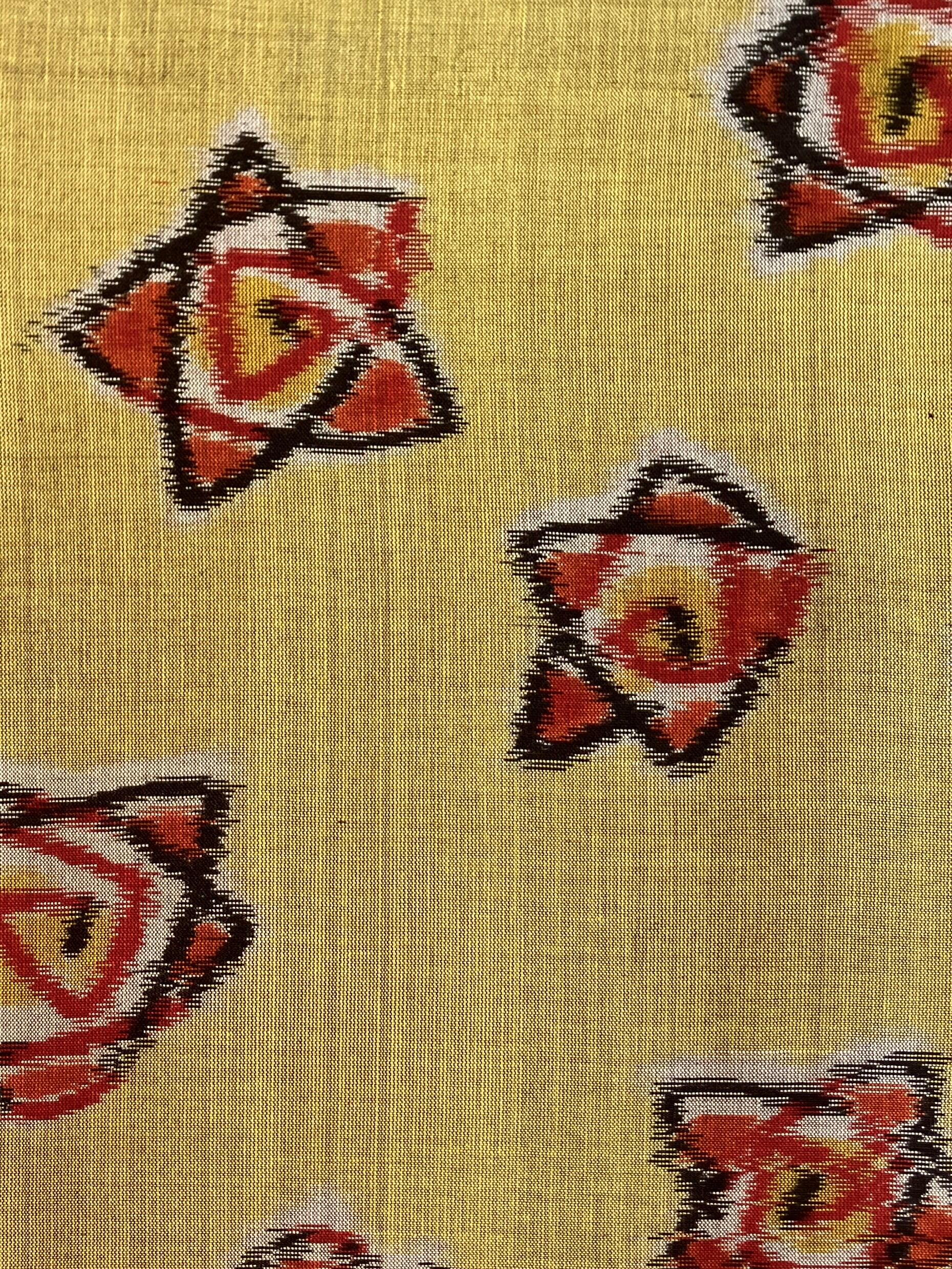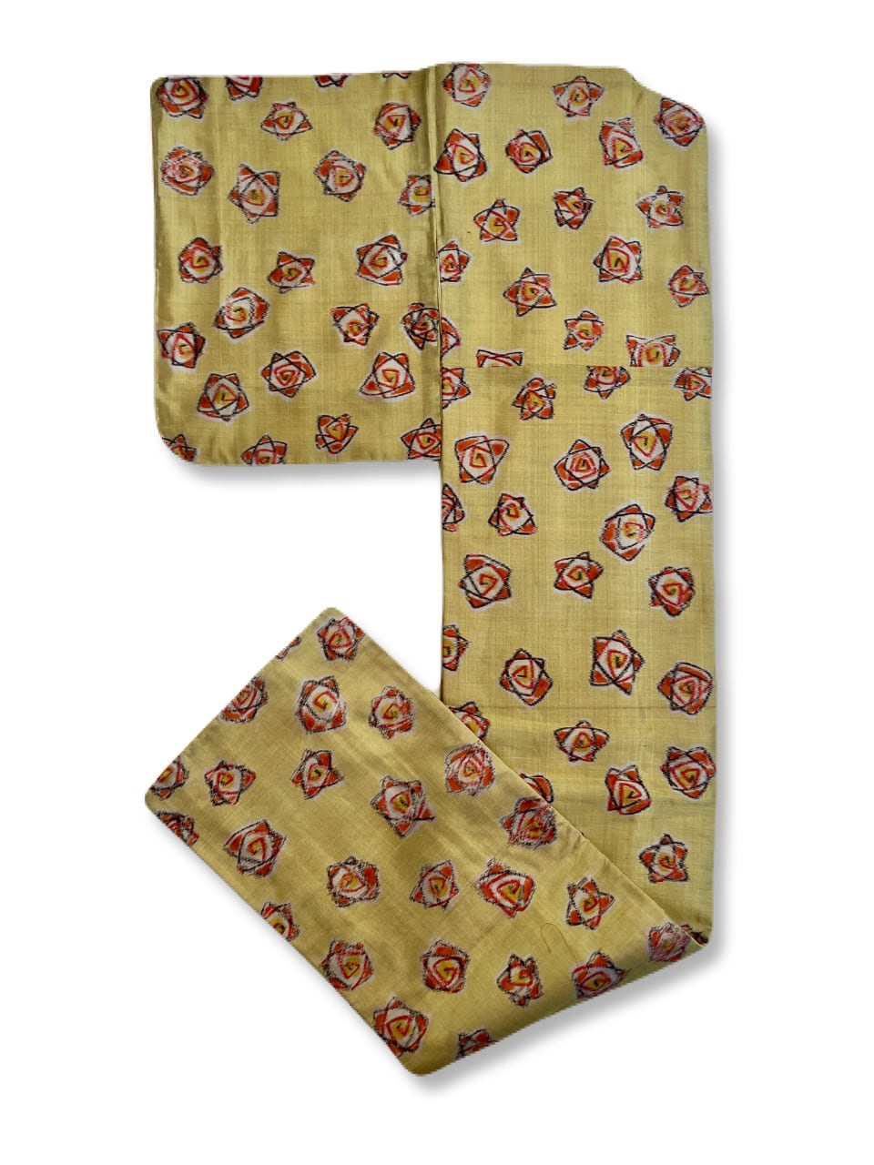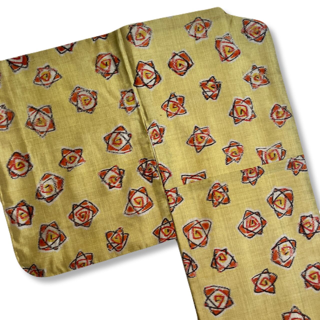 マスタード(くすんだ黄色)の地にオレンジ色のうずまきのバラのような花