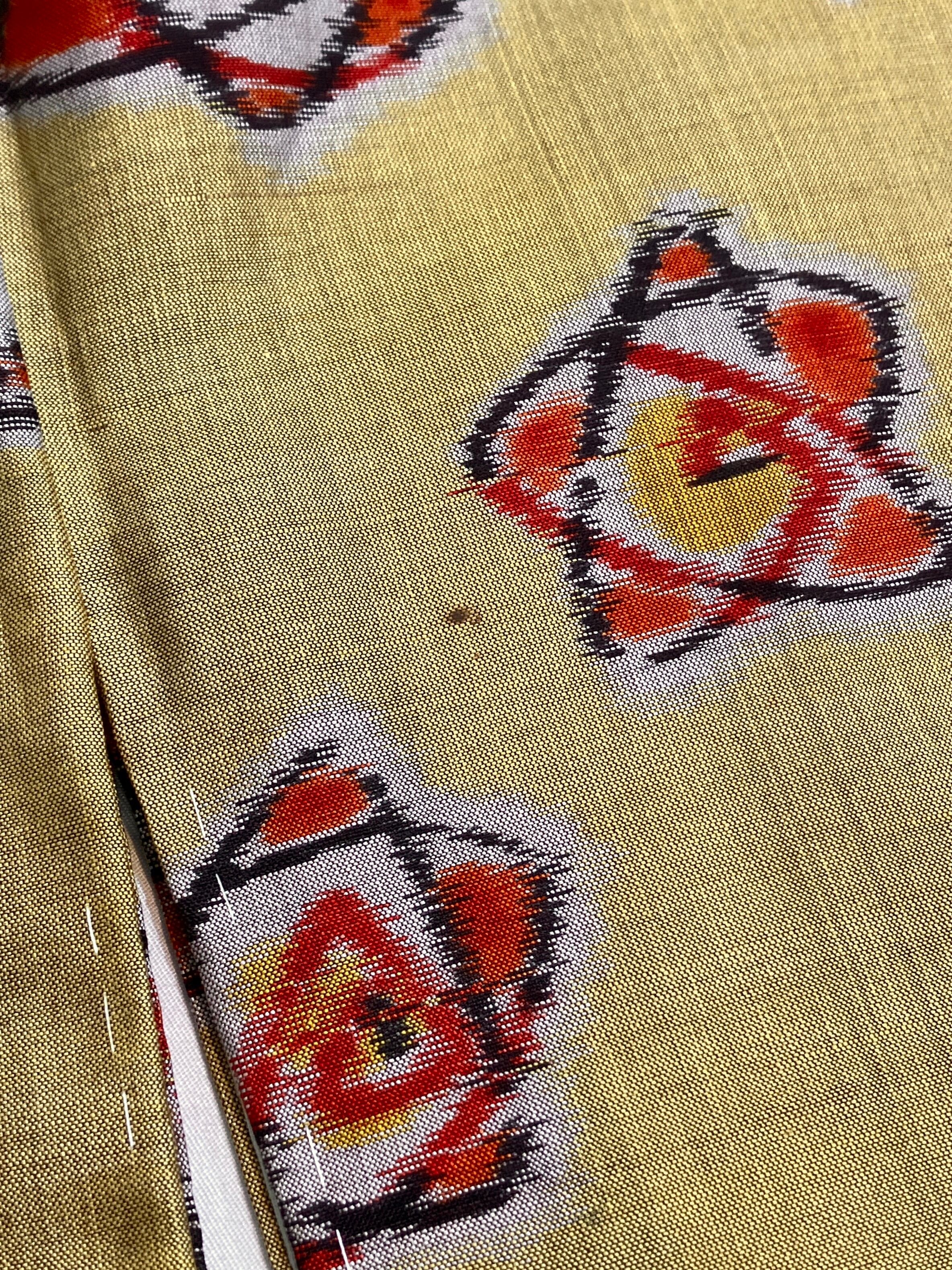 解し織銘仙に似ていますが、縦糸ではなく横糸を柄で染め分けてから織り上げる緯総(よこそう)銘仙です。