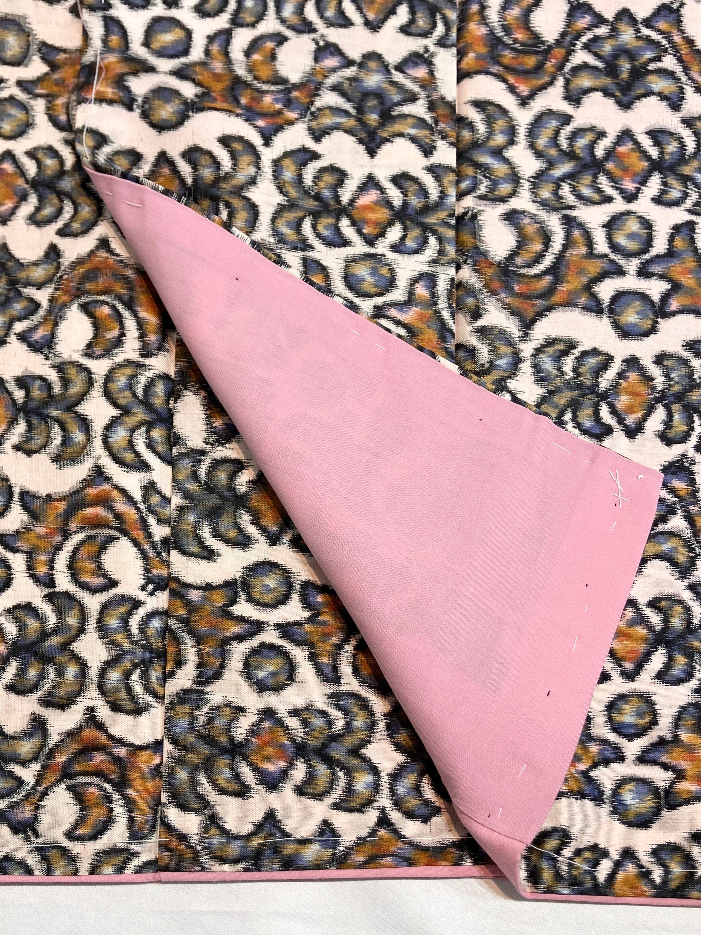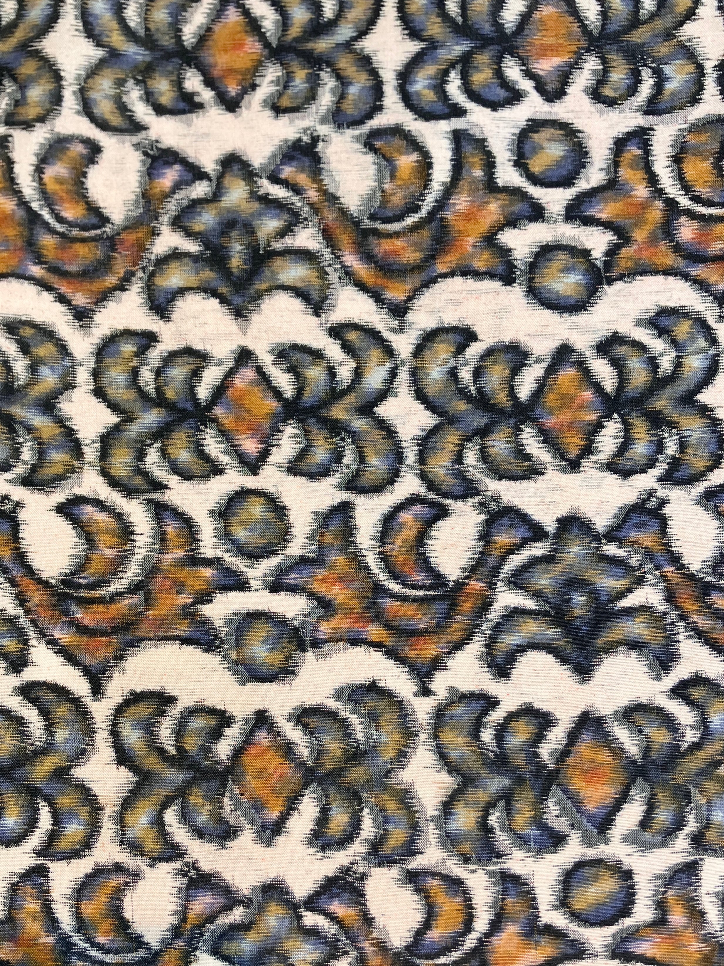 はっきりとした色味とモダンな柄、薄手ながらしっかりとしたハリが特徴の併用銘仙です。