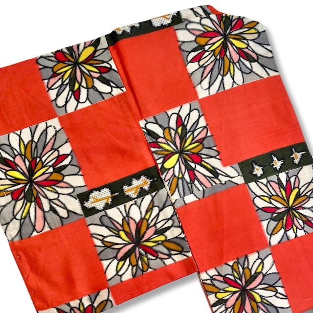銘仙 袷 鮮やかなバーミリオンオレンジ(濃い赤寄りのオレンジ色)の地にモダンでカラフルな菊が市松状に入った柄 パッと目を惹く鮮やかな古典ポップ柄がとっても素敵な銘仙です♪ はっきりとした色味とモダンな柄、薄手ながらしっかりとしたハリが特徴の併用銘仙です。 素材 正絹 サイズ 裄64.5㎝/身丈142㎝/袖丈51㎝ 衽15㎝/前幅23.5㎝/後幅30㎝ 状態 バチ衿 上前腿点シミ 両袖前の袖付寄りに薄シミ その他白地部分に淡い点シミ数箇所 細かなシミ汚れやダメージはご了承ください。 目立つもののみ写真にて表示しています。 ご確認ください。 *************** ◆ご購入に関するご注意◆ *************** ◇当店の商品は、アンティーク・リサイクル品です。 ◇中古品・アンティーク品にご理解のある方のみお買い求めください。 ◇目立つシミやダメージについてはなるべく記載しております。写真にてご確認下さい。 ◇経年劣化により、生地や糸が弱くなっているものがございます。着用により生地が裂けたり、糸が切れてしまう事があります。 ◇長期保管による防虫剤の臭いや、絹のタンパク質による臭いが付いているものが多いです。 ◇実際の色味と異なる場合があります。御了承下さい。 ◇アンティーク品は特に色落ちの可能性が高いです。ご注意ください。